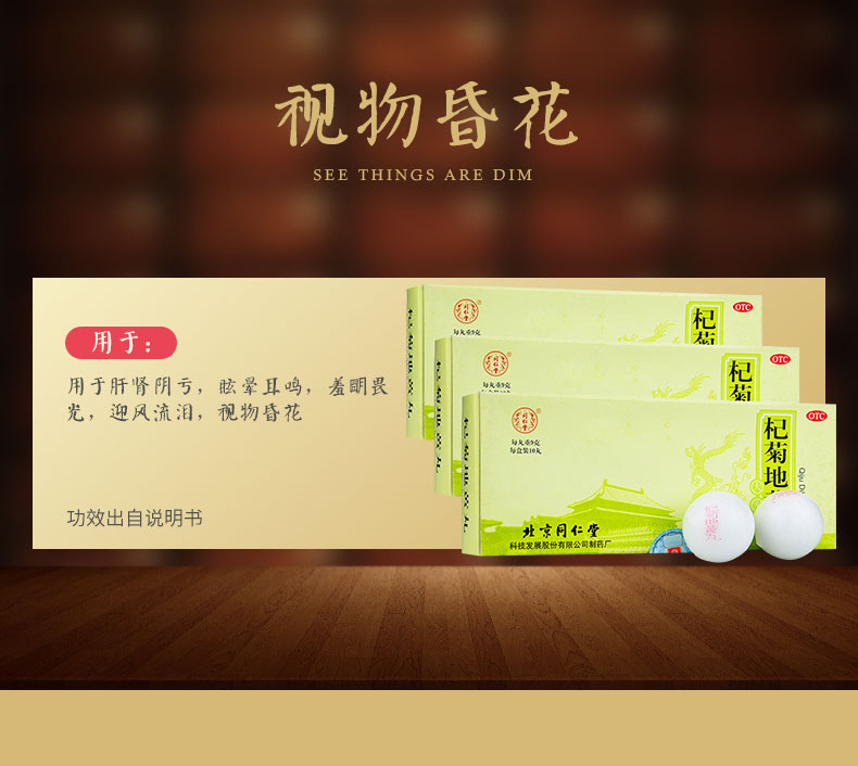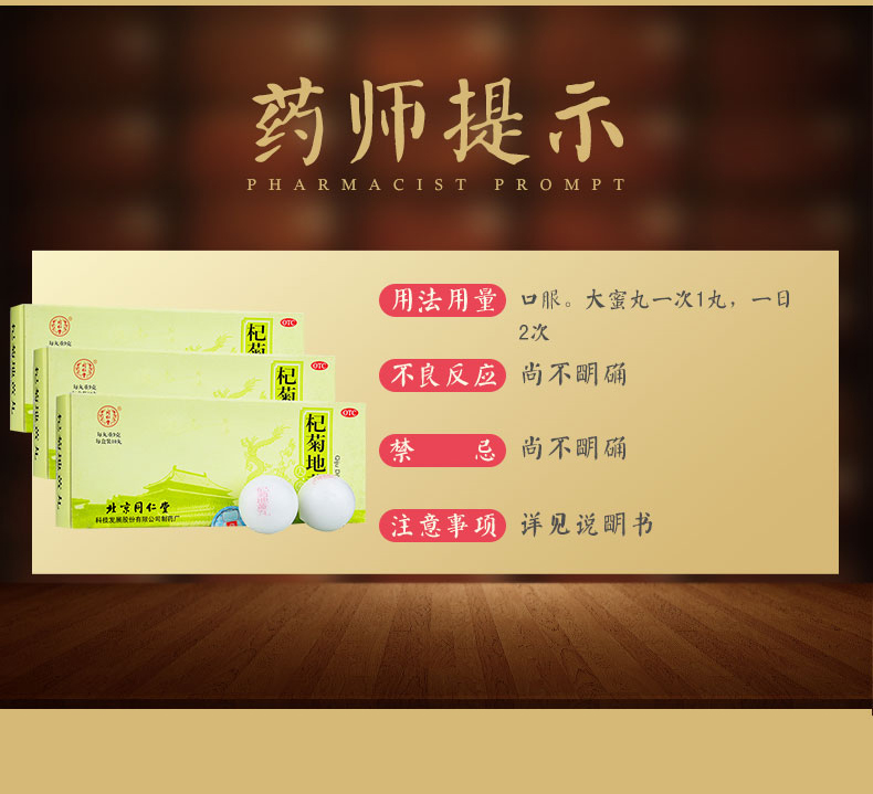 品牌 同仁堂; 批準文號 國藥準字Z11020064; 套餐類型 標準裝; 生產企業 北京同仁堂科技發展股份有限公司; 規格 9g*10丸/盒; 類別 中藥; 產品劑型 丸劑; 用法 口服; 使用劑量 口服。大蜜丸一次1丸,一日2次。; 藥品通用名 杞菊地黃 丸; 藥品名稱 杞菊地黃 丸; 有效期 60個月; 適用人群 不限; 藥品分類 非處方藥; 疾病 肝腎虧虛; 癥狀 頭暈耳鳴 視物模糊;