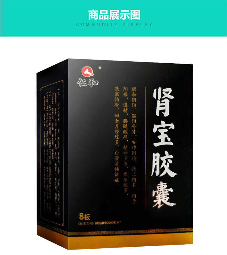 品牌 仁和; 批準文號 國藥準字Z20090387; 套餐類型 標準裝; 生產企業 江西南昌桑海制藥廠; 產品劑型 膠囊; 用法 口服; 使用劑量 1日2-4粒,1日3次; 藥品通用名 腎寶膠囊; 藥品名稱 腎寶膠囊; 有效期 24個月; 適用人群 不限; 藥品類別 中藥; 藥品分類 處方藥; 疾病 陽痿早泄; 癥狀 夜尿頻多 腰腿酸痛 陽痿遺精; 藥品規格 0.5g*72粒/盒;