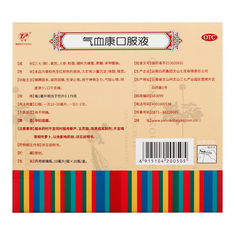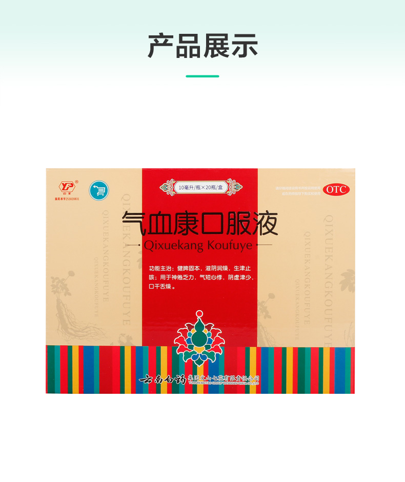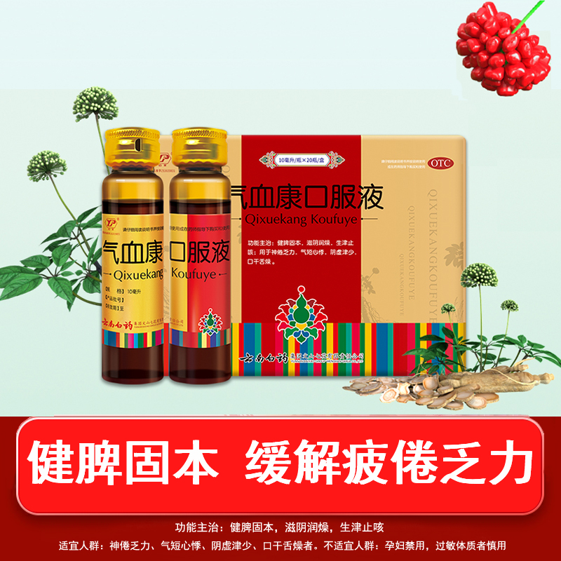 品牌 云豐; 批準文號 國藥準字Z53020831; 套餐類型 標準裝 本品2盒裝; 生產企業 云南白藥集團文山七花有限責任公司; 規格 10ml*20瓶/盒; 類別 中藥; 產品劑型 口服液; 用法 口服; 使用劑量 一次10~30毫升,一日1~2次。; 藥品通用名 氣血康口服液; 藥品名稱 氣血康口服液; 有效期 36個月; 適用人群 不限; 疾病 脾胃虛弱 陰虛; 癥狀 口干舌燥 氣短心悸;