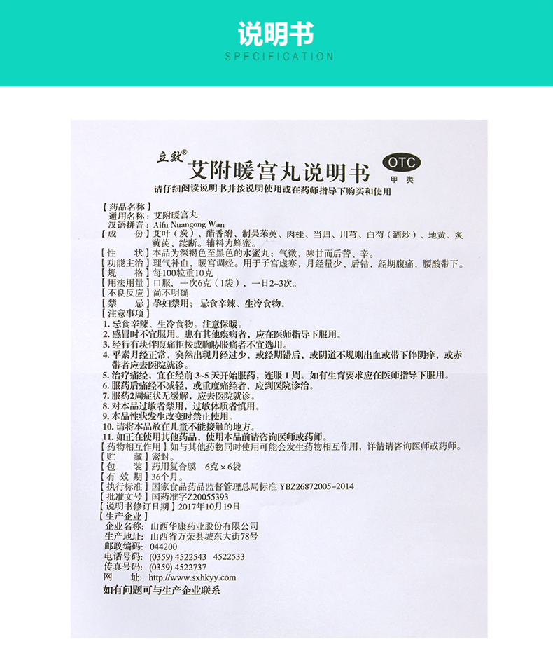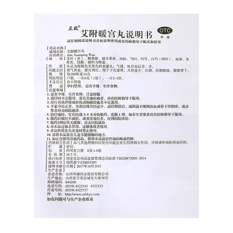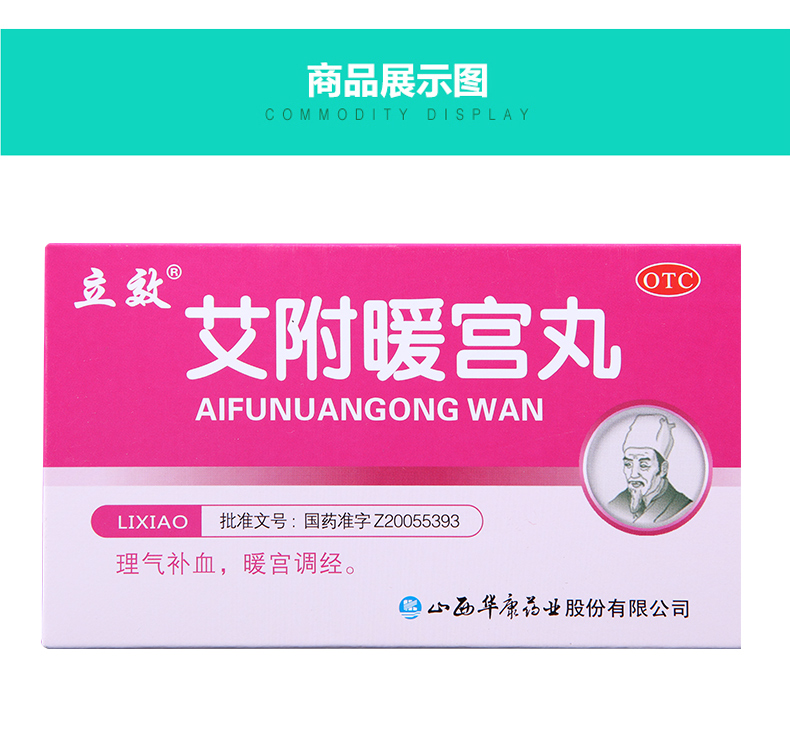 生產日期 2019年01月25日 至 2019年06月07日; 品牌 立效; 藥品名稱 艾附暖宮丸; 規格 6g*6袋/盒; 產品劑型 丸劑; 用法 口服; 疾病 暖宮調經 月經不調; 癥狀 帶多清稀 經期腰腹冷痛 經期錯后 帶下量多 經少 經血量少 行經腹痛; 藥品分類 非處方藥; 適用人群 成人; 類別 中藥; 套餐類型 標準裝1盒(6袋/盒) 套餐一:3盒裝【6.8元/盒】 套餐二:6盒療程裝【6.5元/盒】 套餐三:10盒療程裝【6元/盒】; 使用劑量 一次6克,一日2~3次; 批準文號 國藥準字Z20055393; 藥品通用名 艾附暖宮丸; 生產企業 山西華康藥業股份有限公司; 有效期 36個月;