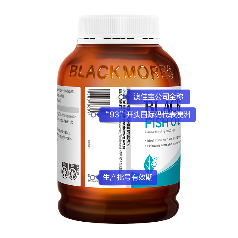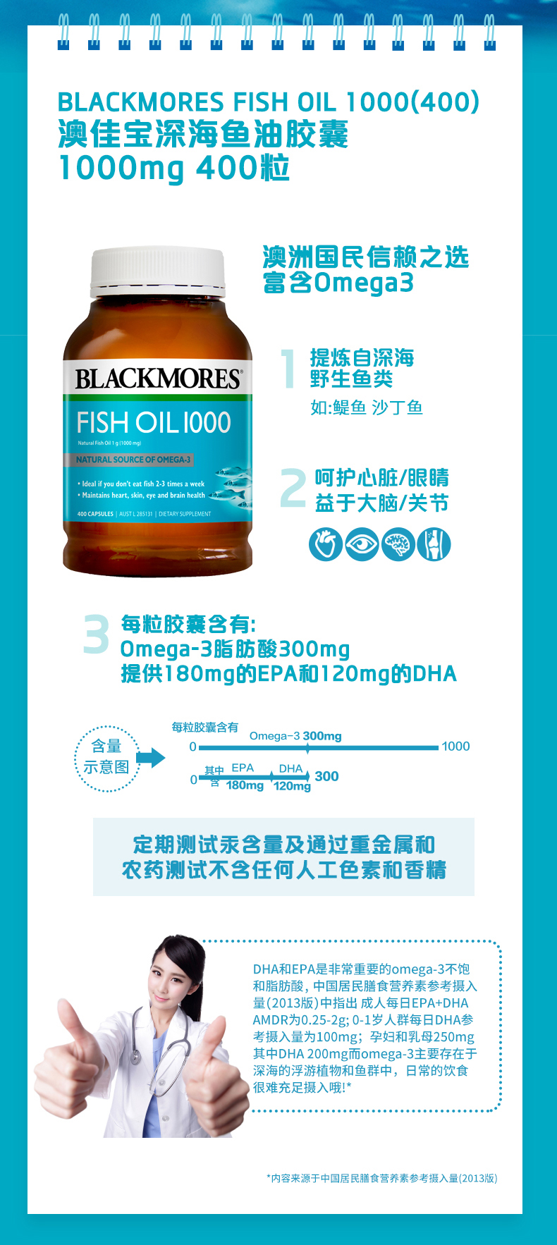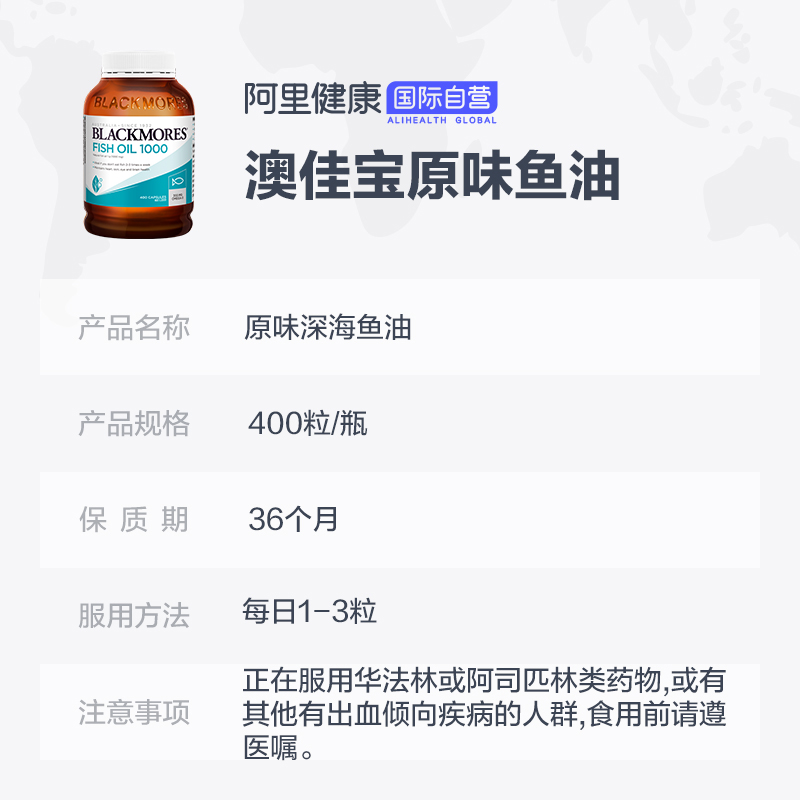 品牌 BLACKMORES/澳佳寶; 系列 深海魚油原味軟膠囊; 產地 澳大利亞; 適用性別 通用; 保質期 36個月; 生產企業 BLACKMORES LIMITED; 產品劑型 膠囊; 規格(粒/袋/ml/g) 400粒/瓶; 計價單位 瓶; 用法 成人每日2粒隨餐服用;兒童每日1粒;作為關節炎治療輔助使用每天3次每次4粒或遵醫囑; 適用人群 成人; 食用提示 孕婦或哺乳期請遵醫囑,存放于30攝氏度以下干燥環境,服用周期6個月; 效期說明 無; 廠名 BLACKMORES LIMITED; 廠址 BLACKMORES LIMITED; 廠家聯系方式 0061-1800803760; 保質期 1095;