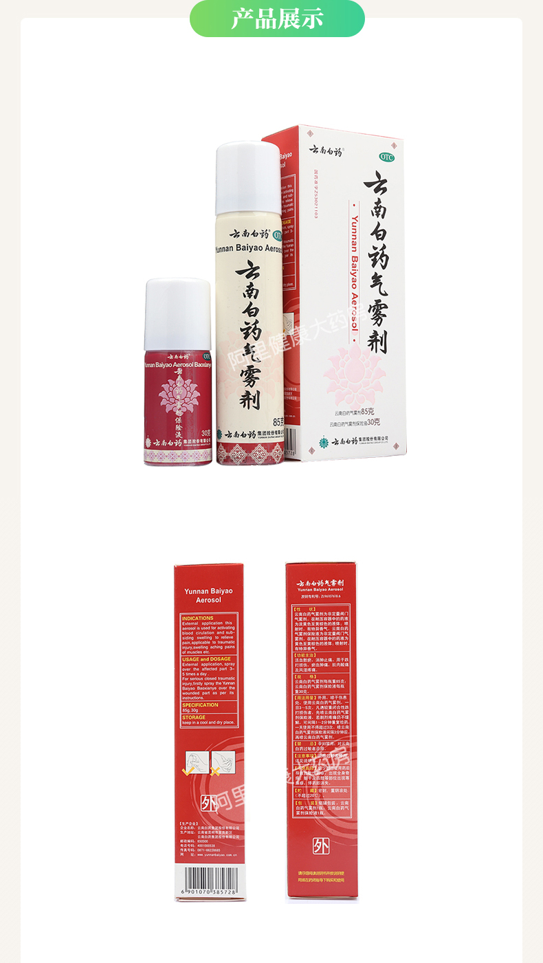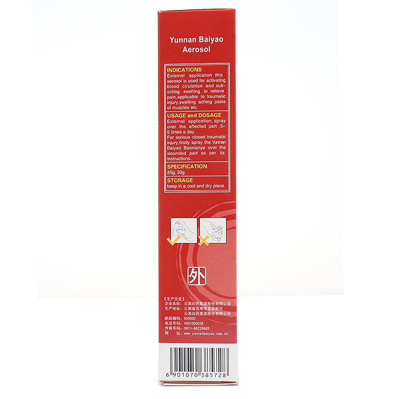 品牌 云南白藥; 批準文號 國藥準字Z53021103; 套餐類型 標準裝 (85g*1瓶+30g*1瓶)/盒; 生產企業 云南白藥集團股份有限公司; 規格 (85g*1瓶+30g*1瓶)/盒; 類別 中藥; 產品劑型 外用液體劑; 用法 皮膚外用; 使用劑量 噴于傷患處一日3~5次; 藥品通用名 云南白藥氣霧劑; 藥品名稱 云南白藥氣霧劑; 有效期 36個月; 適用人群 不限; 藥品分類 非處方藥; 疾病 瘀血腫痛 肌肉酸痛 跌打損傷 外傷 韌帶損傷 風濕疼痛 風濕骨痛; 癥狀 肌肉酸痛 跌打損傷 風濕疼痛 關節紅腫 扭拉傷 瘀腫 瘀血腫痛;