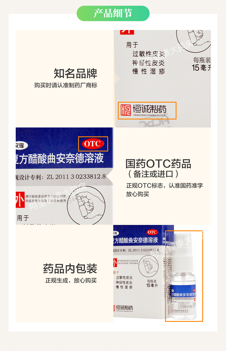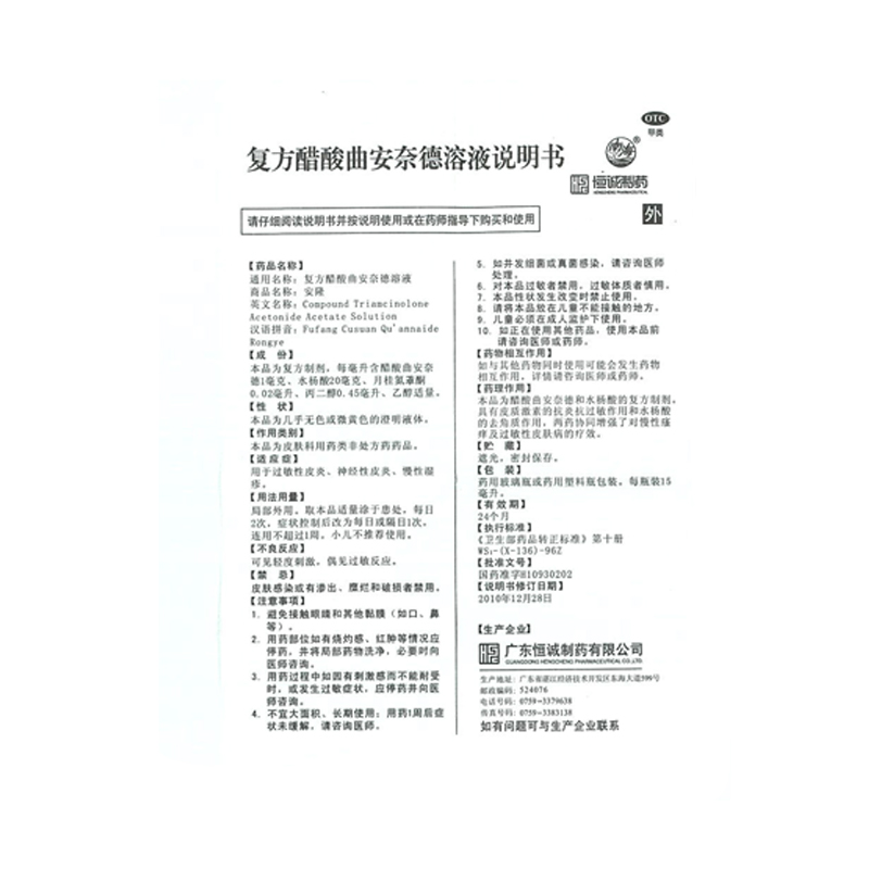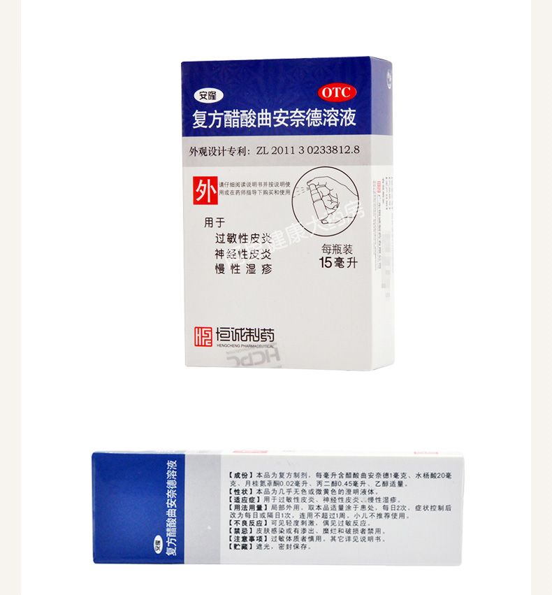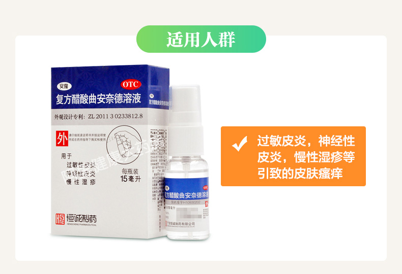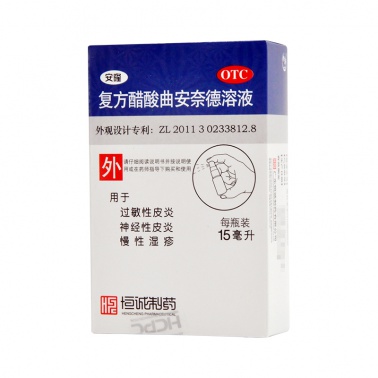 生產日期 2019年05月15日 至 2019年06月22日; 品牌 恒誠制藥; 批準文號 國藥準字H10930202; 套餐類型 標準裝:1盒(15ml*1瓶/盒) 套餐一 本品2盒裝 本品5盒裝; 規格 15ml*1瓶/盒; 生產企業 廣東恒誠制藥股份有限公司; 產品劑型 外用液體劑; 用法 皮膚外用; 使用劑量 每日2次,癥狀控制后改為每日1次,連用不超過1周; 藥品通用名 復方醋酸曲安奈德溶液; 藥品商品名 安隆; 藥品名稱 安隆 復方醋酸曲安奈德溶液; 有效期 24個月; 適用人群 不限; 藥品類別 化學藥; 藥品分類 非處方藥; 疾病 慢性濕疹 過敏性皮炎 神經性皮炎; 癥狀 慢性濕疹 神經性皮炎 過敏性皮炎;