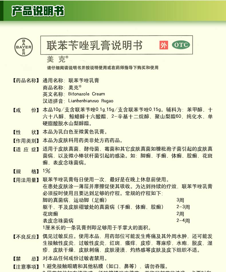 生產日期 2017年11月09日 至 2018年05月17日; 品牌 美克; 批準文號 國藥準字H20003009; 套餐類型 去腳氣搭配本品1盒+復方十一烯酸鋅軟膏15g 標準裝1盒 2盒優惠裝 1盒本品+艾邦醫用棉簽50支 1盒本品+婦炎潔植物本草抑菌洗液300ml; 規格 10g*1支/盒; 生產企業 拜耳醫藥保健有限公司; 產品劑型 軟膏劑; 用法 皮膚外用; 使用劑量 每日使用一次,詳見說明書; 藥品通用名 聯苯芐唑乳膏; 藥品商品名 美克; 藥品名稱 美克 聯苯芐唑乳膏; 有效期 60個月; 適用人群 不限; 藥品類別 化學藥; 藥品分類 非處方藥; 疾病 體癬 念珠菌病 手癬 股癬 腳癬 花斑癬 足癬; 癥狀 體癬 手癬,足癬,體癬 瘙癢 脫皮 苔蘚樣增厚;