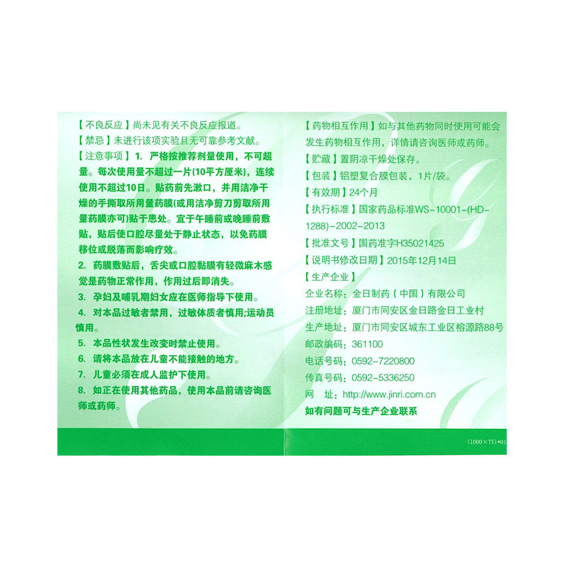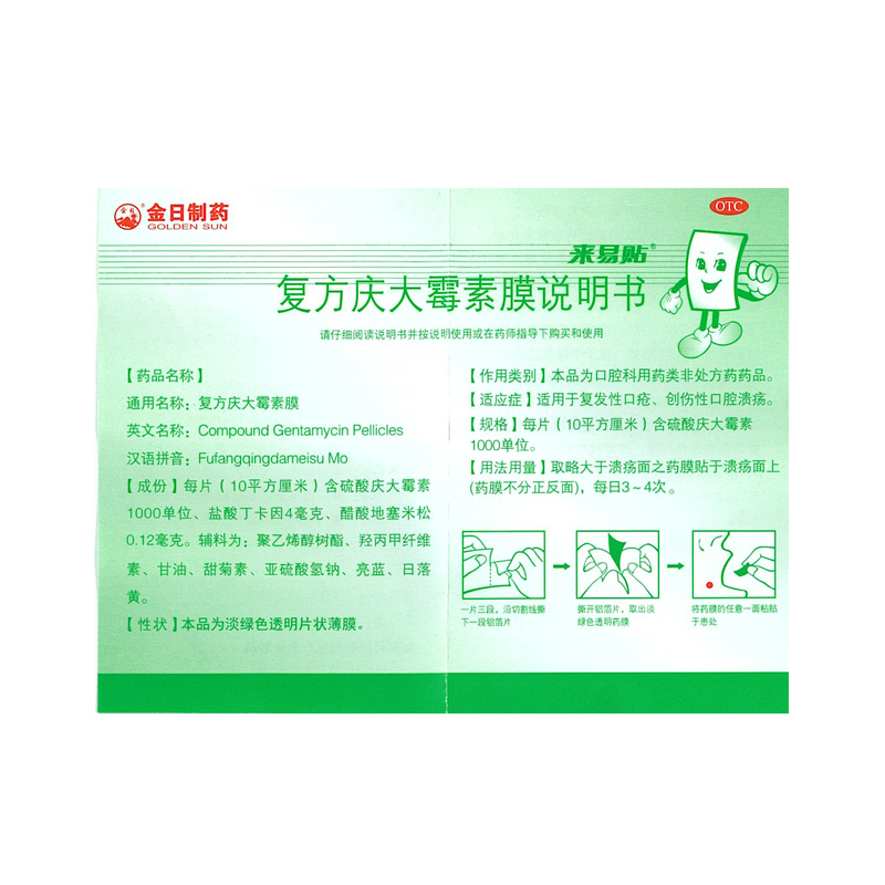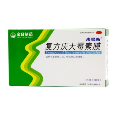 生產日期 2019年05月13日 至 2019年08月05日; 品牌 GOLDENSUN/金日; 批準文號 國藥準字H35021425; 套餐類型 本品3盒 本品5盒 本品1盒; 生產企業 廈門金日制藥有限公司; 規格 6片/盒; 類別 復方制劑; 產品劑型 貼劑; 用法 口腔貼膜; 使用劑量 取略大于潰瘍面之藥膜貼于潰瘍面上,每日3-4次; 藥品通用名 復方慶大霉素膜; 藥品名稱 復方慶大霉素膜; 有效期 24個月; 適用人群 不限; 藥品分類 非處方藥; 疾病 創傷性口腔潰瘍 口腔潰瘍 口腔炎 口腔皰疹 復發性口瘡; 癥狀 創傷性口腔潰瘍 復發性口瘡 口腔潰爛 口舌生瘡;