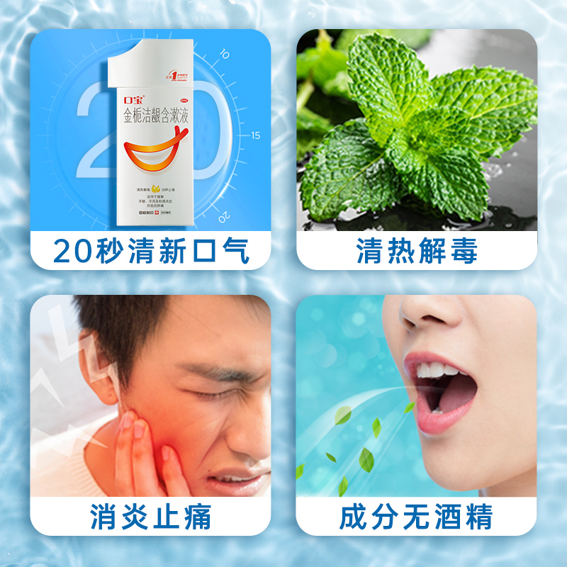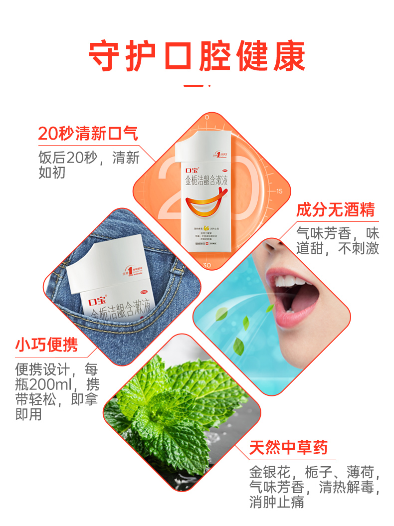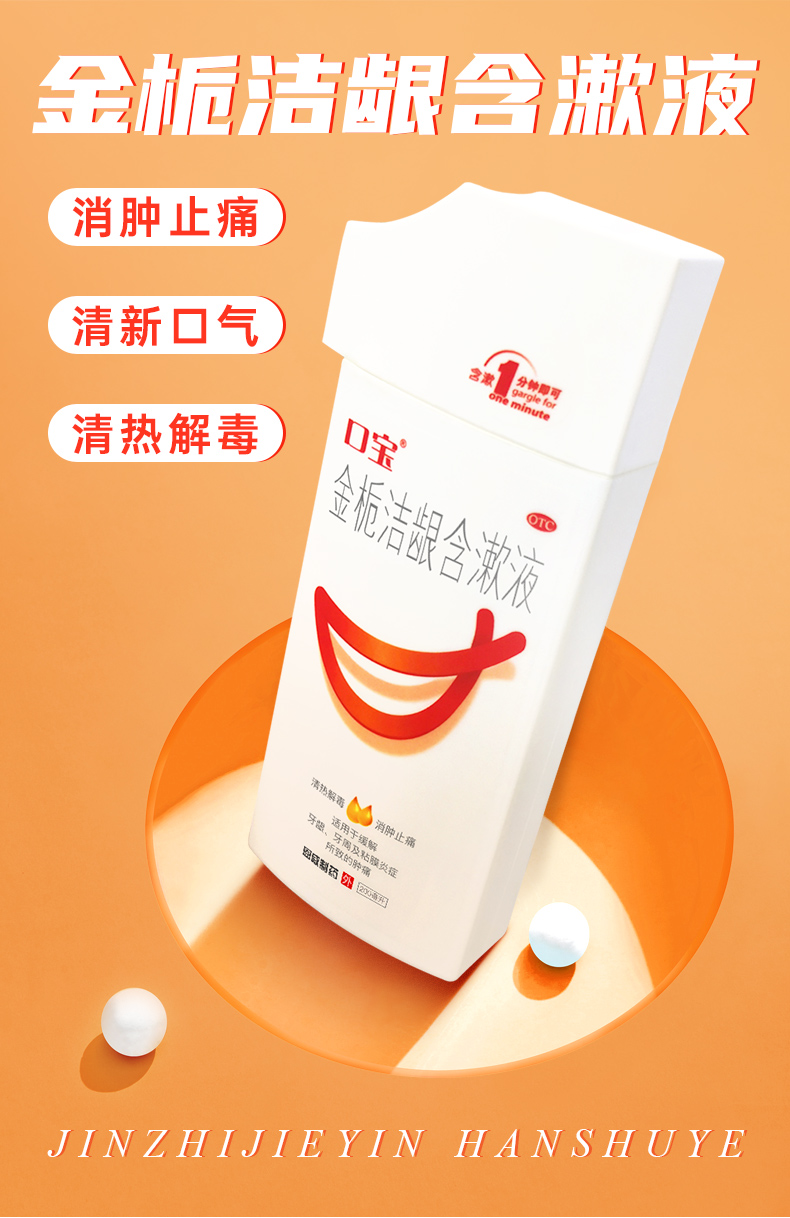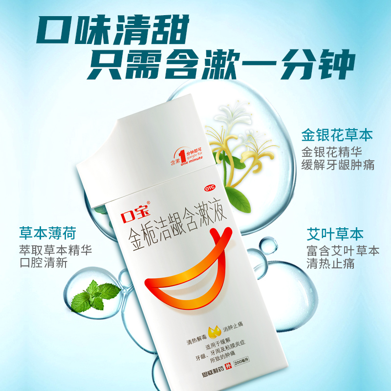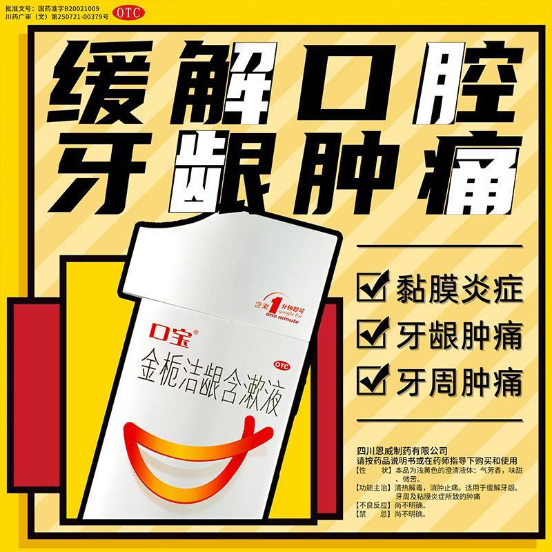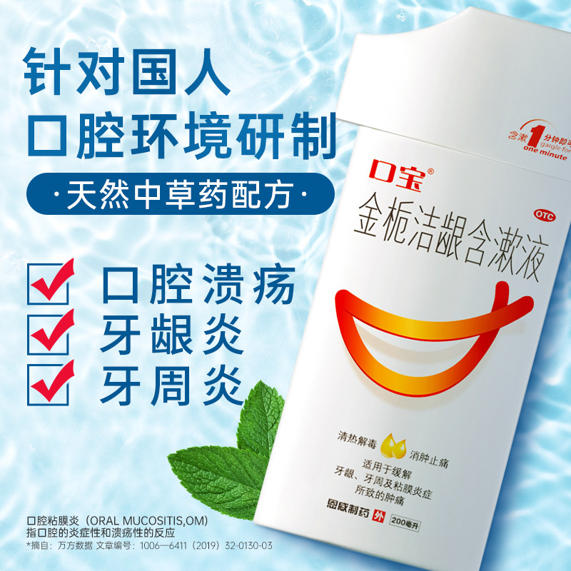 品牌 口寶; 批準文號 國藥準字B20021009; 套餐類型 3瓶裝 【牙齦紅腫發炎 消腫止痛】(推薦用量)收藏加購優先發貨 6瓶裝【牙齦炎 牙周炎 口腔潰瘍】收藏加購優先發貨 1瓶裝 【推薦3瓶 牙齦腫痛 緩解口腔潰瘍】收藏加購優先發貨; 生產企業 四川恩威制藥有限公司; 規格 200ML/瓶; 類別 中藥; 產品劑型 外用液體劑; 用法 含漱; 使用劑量 一次5~20毫升,一日3次; 藥品通用名 金梔潔齦含漱液; 藥品名稱 金梔潔齦含漱液; 有效期 36個月; 適用人群 成人; 藥品分類 非處方藥; 疾病 冠周炎 口瘡 口腔潰瘍 口腔炎 口腔皰疹 口角炎 牙周炎 牙髓炎 牙齦炎 鵝口瘡 齲病; 癥狀 冠周炎 創傷性口腔潰瘍 口腔感染 口腔潰瘍 口腔炎 口腔黏膜炎 咽喉炎 咽喉腫痛 復發性口瘡 復發性口腔潰瘍 急性咽炎 慢性咽炎 慢性炎后、口腔潰爛、慢性牙齦炎、牙周炎 牙周炎 牙周膿腫 牙痛 牙齦炎 紅腫 非感染性口腔黏膜潰瘍 口干口臭 口瘡炎癥 口腔潰爛 口腔炎癥 口舌生瘡 牙齦出血 牙齦溢膿 牙齦紅腫 牙齦腫痛 牙齦腫脹 風火牙痛;