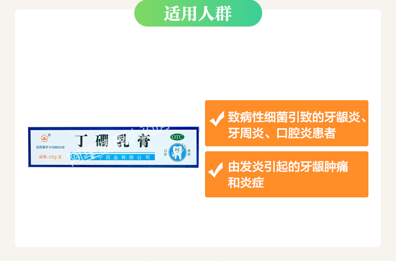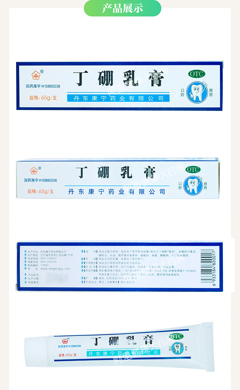 生產日期 2019年05月06日 至 2019年07月03日; 品牌 永; 批準文號 國藥準字H10880036; 套餐類型 3盒優惠裝(65g*1支/盒) 標準裝:1盒(65g*1支/盒) 本品1盒 + 西帕依固齦液100ml 本品2盒裝; 生產企業 丹東康寧藥業有限公司; 規格 65g*1支/盒; 類別 復方制劑; 產品劑型 軟膏劑; 用法 皮膚外用; 使用劑量 將乳膏涂抹于患處,一次1克,一日3~4次。; 藥品通用名 丁硼乳膏; 藥品名稱 丁硼乳膏; 有效期 36個月; 適用人群 不限; 藥品分類 非處方藥; 疾病 消炎 止痛 牙周炎 牙齦炎 牙髓炎 出血 口腔炎 紅腫; 癥狀 牙齦出血 牙齦腫痛;