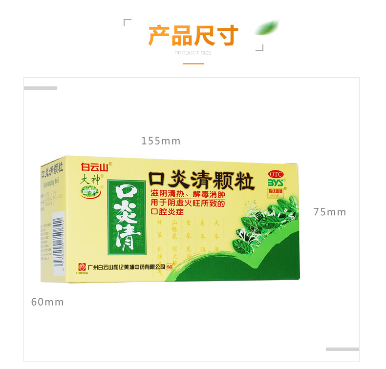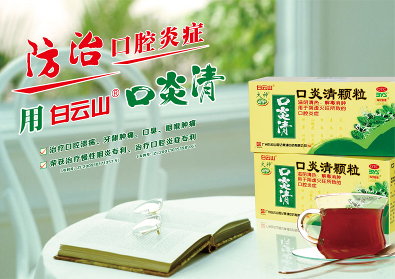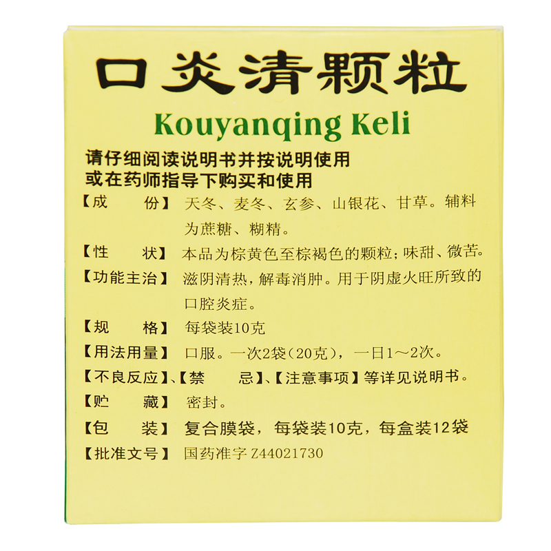 生產日期 2019年06月06日 至 2019年06月17日; 品牌 白云山; 批準文號 國藥準字Z44021730; 套餐類型 本品1盒 本品3盒裝; 生產企業 廣州白云山和記黃埔中藥有限公司; 規格 10g*12袋/盒; 類別 中藥; 產品劑型 顆粒; 用法 口服; 使用劑量 口服,一次2袋(20克),一日1-2次。; 藥品通用名 口炎清顆粒; 藥品名稱 口炎清顆粒; 有效期 24個月; 適用人群 不限; 藥品分類 非處方藥; 疾病 口腔炎; 癥狀 口腔潰爛;