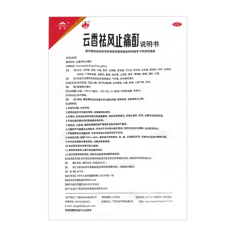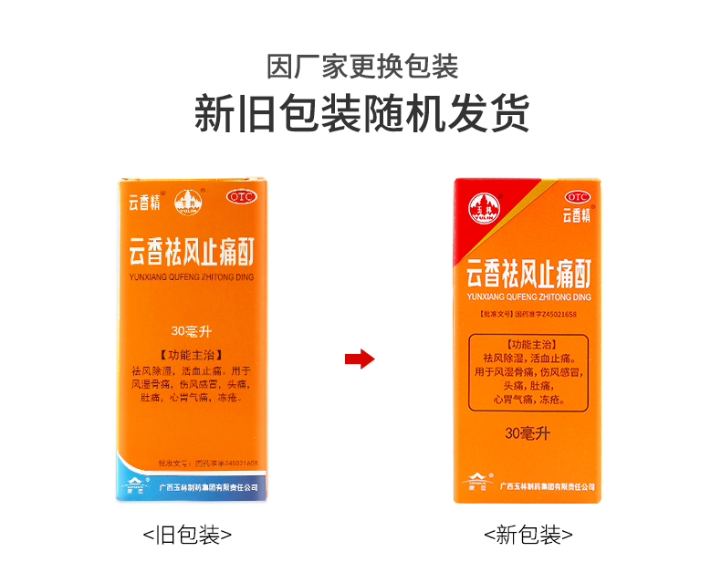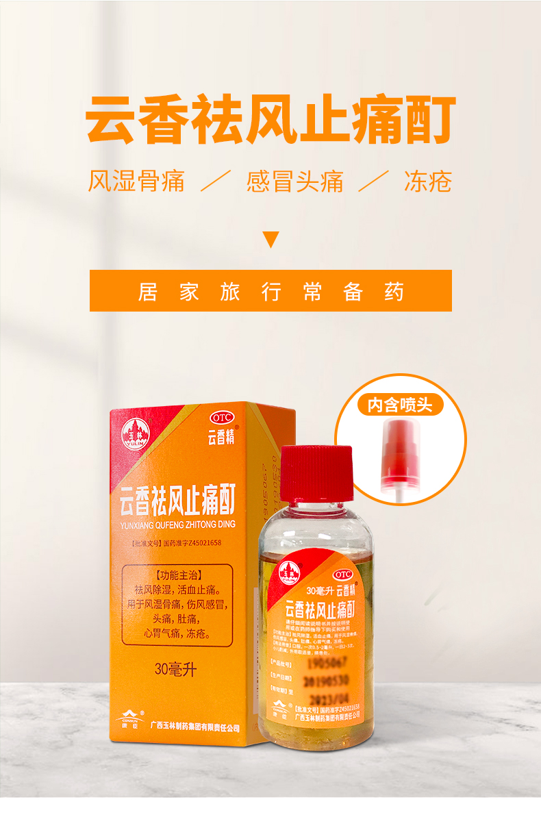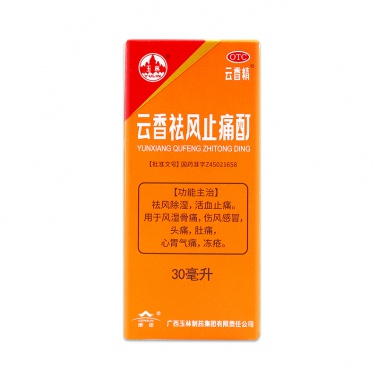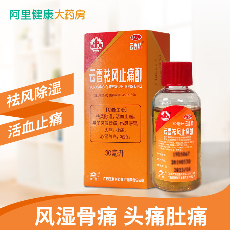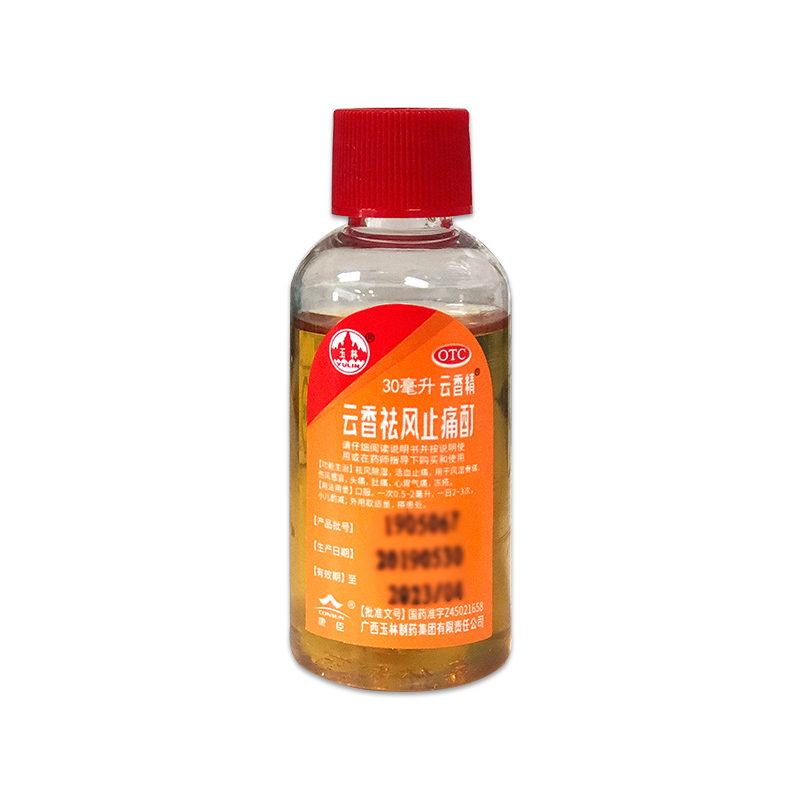 生產日期 2018年10月11日 至 2018年11月14日; 品牌 玉林; 批準文號 國藥準字Z45021658; 套餐類型 標準裝 本品3盒裝; 生產企業 廣西玉林制藥集團有限責任公司; 規格 30ml*1瓶/盒; 類別 中藥; 產品劑型 口服液; 用法 口服; 使用劑量 一次0.5-2ml,一日2-3次; 藥品通用名 云香祛風止痛酊; 藥品名稱 云香祛風止痛酊; 有效期 48個月; 適用人群 成人; 藥品分類 非處方藥; 疾病 風濕骨痛; 癥狀 風濕骨痛;