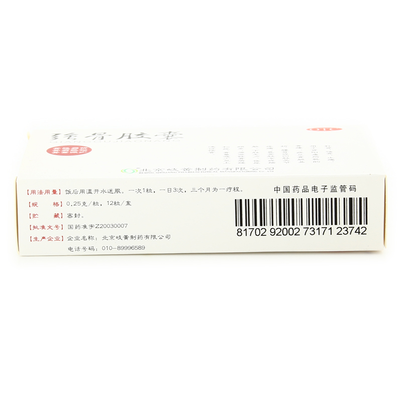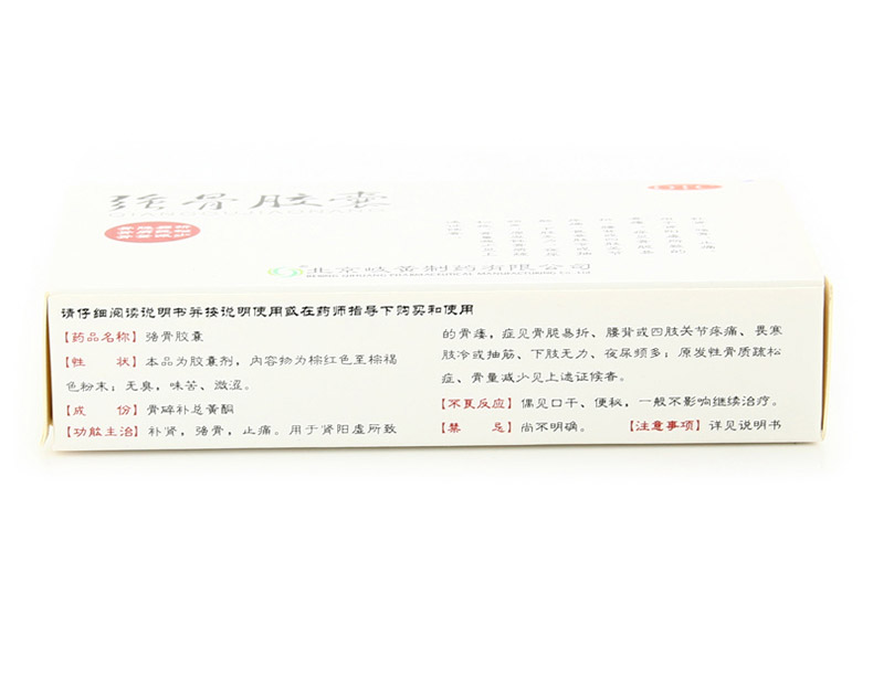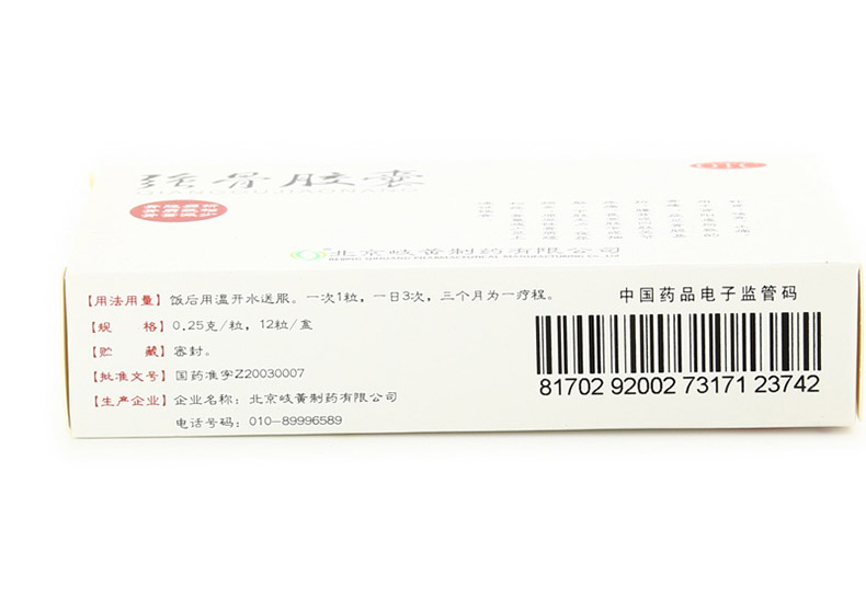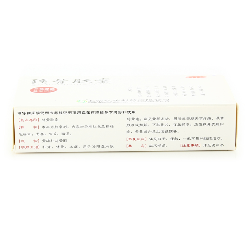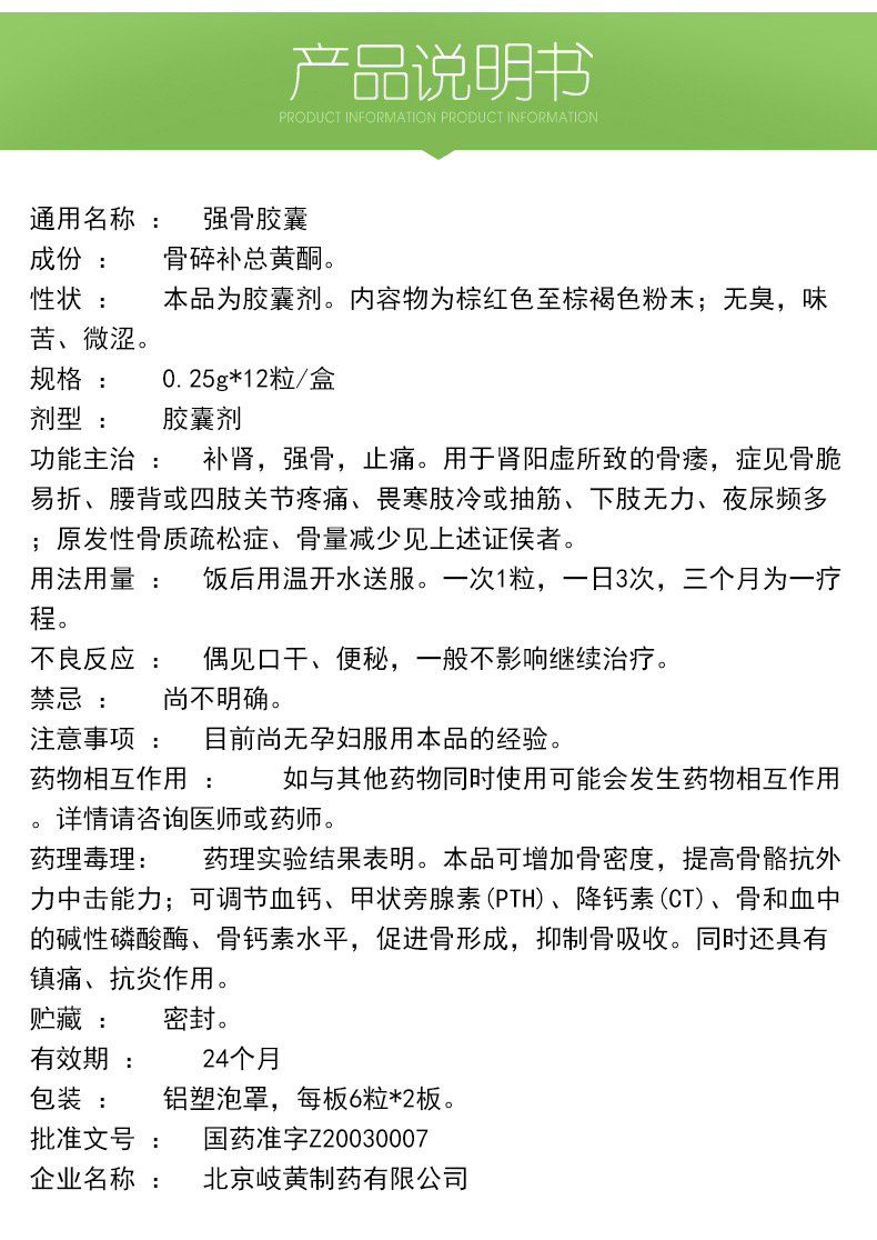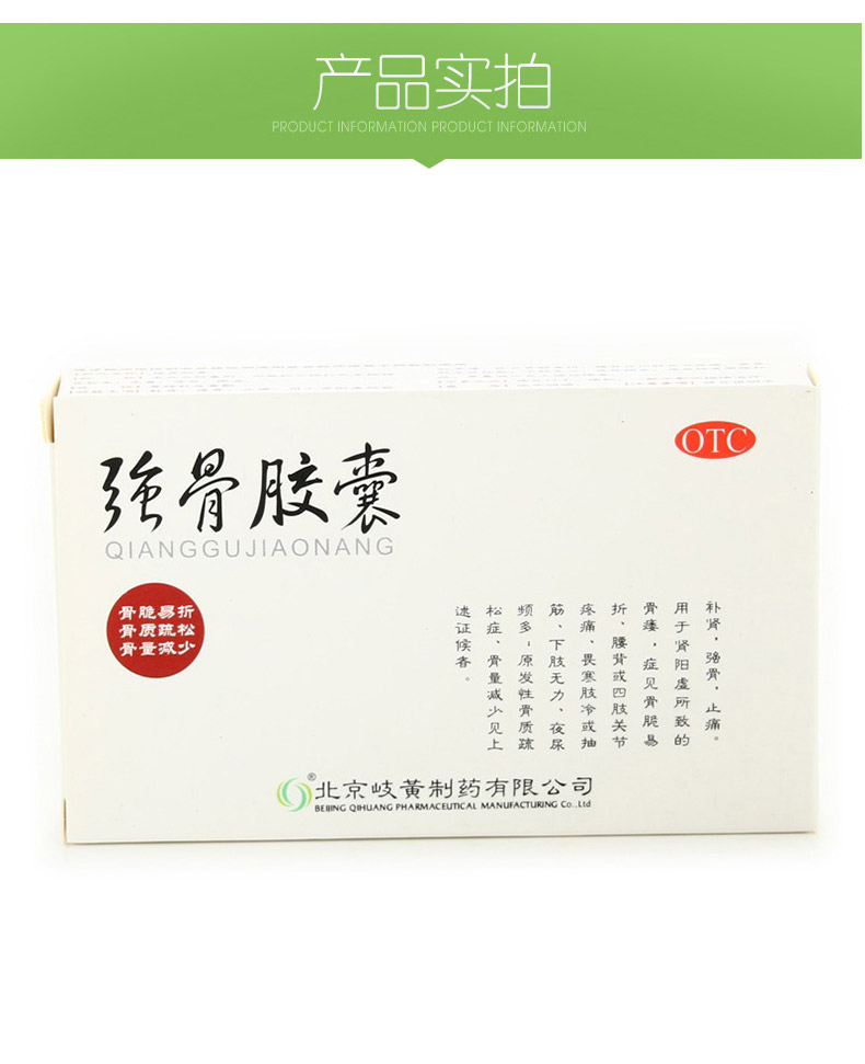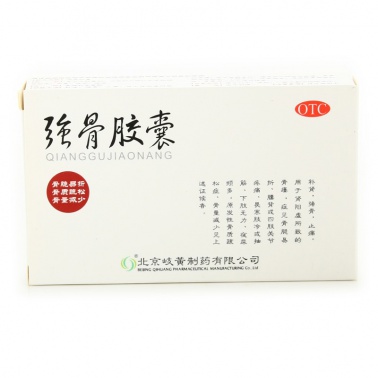 產品劑型 膠囊; 使用劑量 1次1粒 1日3次; 品牌 岐黃; 套餐類型 標準裝; 批準文號 國藥準字Z20030007; 有效期 2年; 生產企業 北京岐黃制藥有限公司; 用法 口服; 疾病 骨質疏松癥; 癥狀 肌肉疼痛; 類別 中藥; 藥品分類 非處方藥; 藥品名稱 強骨膠囊; 藥品通用名 強骨膠囊; 規格 0.25g*12粒/盒; 適用人群 不限;