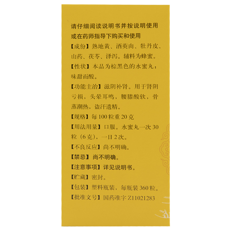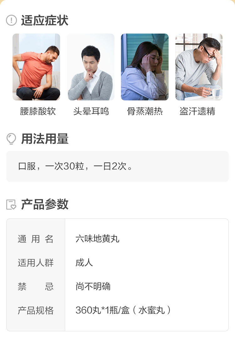 品牌 同仁堂; 批準文號 國藥準字Z11021283; 套餐類型 【9盒裝】拍1件發9盒,療程裝,一次30粒一日2次 【治腎虛早泄】本品360丸*3盒+五子衍宗丸60g*3盒 【治精神不振】本品3盒*360丸+匯仁腎寶片63片 【標準裝:3盒】約15天量,一次30粒一日2次; 生產企業 北京同仁堂科技發展股份有限公司; 規格 360粒*1瓶/盒; 類別 中藥; 產品劑型 丸劑; 用法 口服; 使用劑量 一次30粒一日2次; 藥品通用名 六味地黃丸; 藥品名稱 六味地黃丸; 有效期 48個月; 適用人群 不限; 藥品分類 非處方藥; 疾病 腎虧虛 腎陰虧; 癥狀 頭暈耳鳴 盜汗 腰膝酸軟 遺精;