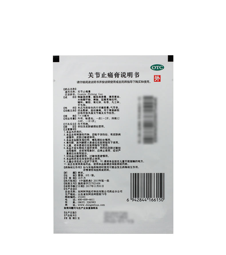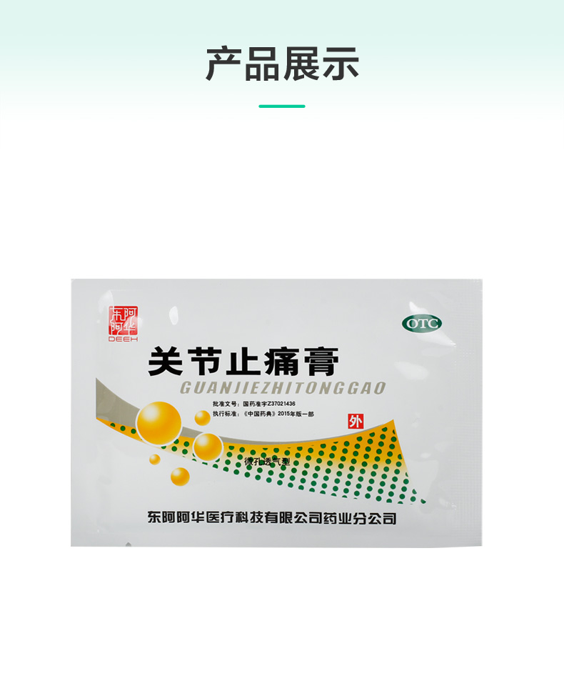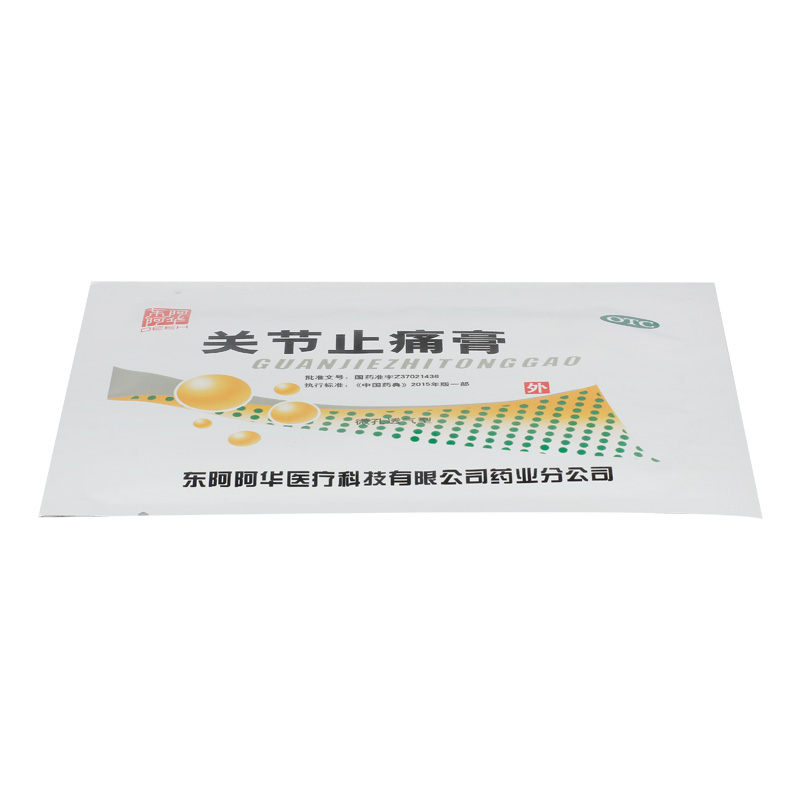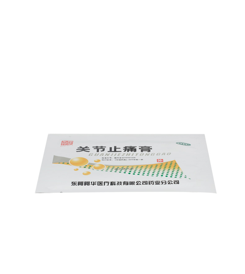 品牌 東阿阿膠; 批準文號 國藥準字Z37021436; 套餐類型 標準裝 本品4盒裝 本品10盒裝; 生產企業 東阿阿華醫療科技有限公司藥業分公司; 規格 8貼/袋; 類別 中藥; 產品劑型 貼劑; 用法 皮膚外用; 使用劑量 貼患處,一次1-2片,持續12小時,一日一次; 藥品通用名 關節止痛膏; 藥品名稱 關節止痛膏; 有效期 18個月; 適用人群 不限; 藥品分類 非處方藥; 疾病 活血 風濕 關節炎 關節痛 關節扭傷; 癥狀 關節痛 關節扭傷 扭拉傷;