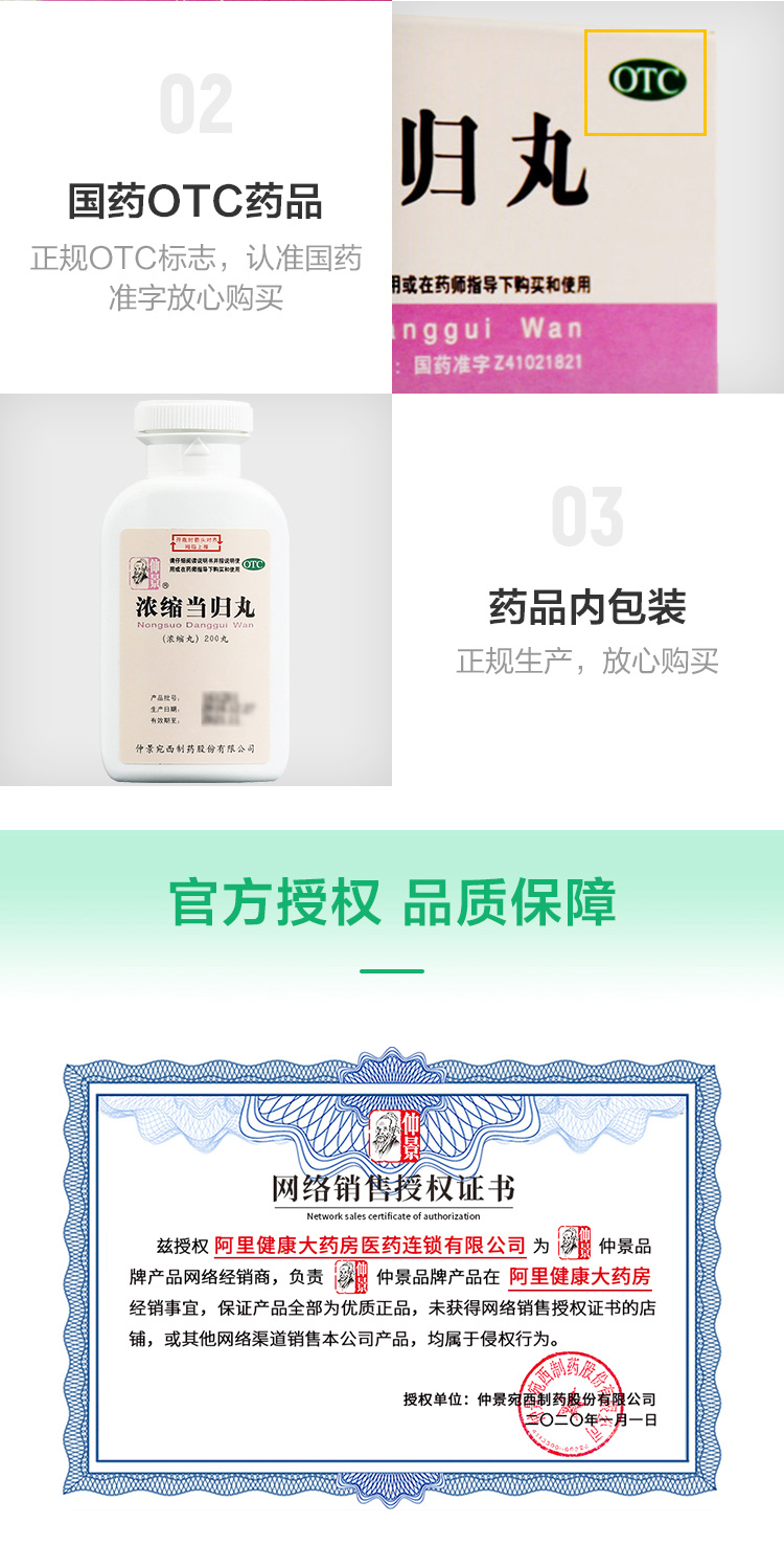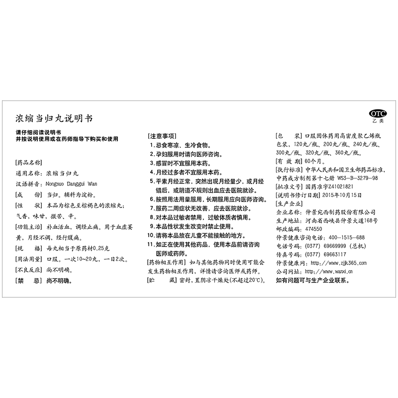 生產日期 2018年11月14日 至 2018年12月21日; 品牌 仲景; 批準文號 國藥準字Z41021821; 套餐類型 標準裝:1盒200丸,一次10-20丸,一日2次 本品3盒裝 本品2盒裝; 生產企業 仲景宛西制藥股份有限公司; 規格 200丸*1瓶/盒; 類別 中藥; 產品劑型 丸劑; 用法 口服; 使用劑量 一次10-20丸,一日2次; 藥品通用名 濃縮當歸丸; 藥品名稱 濃縮當歸丸; 有效期 60個月; 適用人群 婦科; 藥品分類 非處方藥; 疾病 月經不調; 癥狀 月經不調;