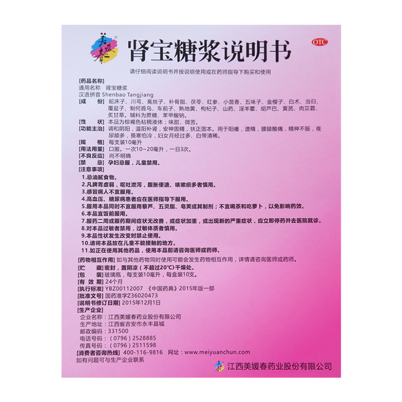 品牌 美媛春; 批準文號 國藥準字Z36020473; 套餐類型 標準裝 套餐一:1盒裝10支(1次1-2支,一天3次) 套餐二:5盒裝(可服用8~16天) 套餐三:10盒裝(可服用16~33天); 生產企業 江西廣恩和藥業股份有限公司; 規格 10ml*10支/盒; 類別 中藥; 產品劑型 口服液; 用法 口服; 使用劑量 1次10-20ml 一天3次; 藥品通用名 腎寶糖漿; 藥品商品名 美媛春; 藥品名稱 腎寶糖漿; 有效期 24個月; 適用人群 婦科 成人 男科; 藥品分類 非處方藥; 疾病 月經過多 遺精 精血不足 腎精虧虛 腎陰虧 陽萎 陰陽失調; 癥狀 月經過多 腰腿酸痛 尿頻 早泄 畏寒 畏寒怕冷 疲倦食少 白帶 腰膝酸軟 遺精 陽痿;