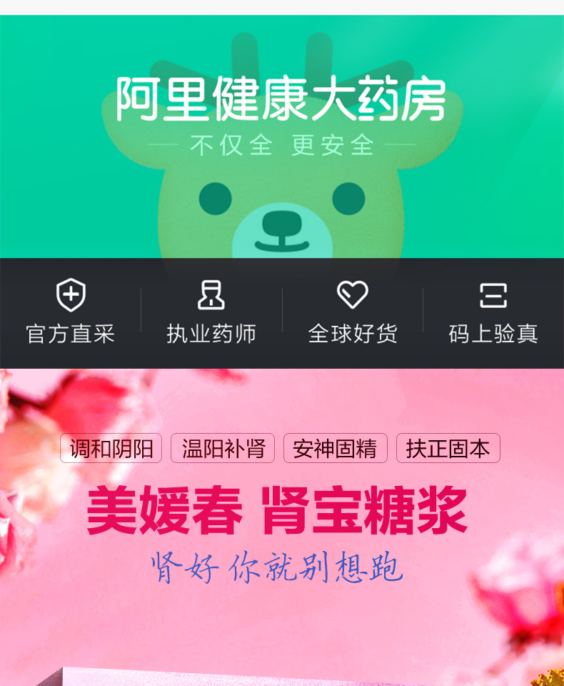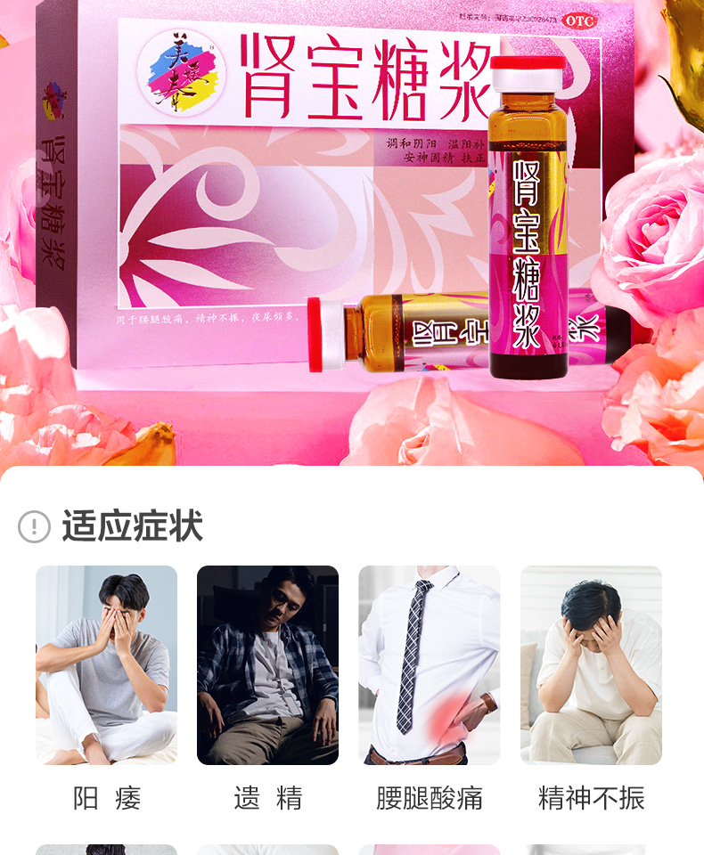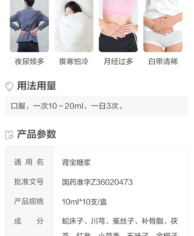品牌 美媛春; 批準文號 國藥準字Z36020473; 套餐類型 標準裝 套餐一:1盒裝10支(1次1-2支,一天3次) 套餐二:5盒裝(可服用8~16天) 套餐三:10盒裝(可服用16~33天); 生產企業 江西廣恩和藥業股份有限公司; 規格 10ml*10支/盒; 類別 中藥; 產品劑型 口服液; 用法 口服; 使用劑量 1次10-20ml 一天3次; 藥品通用名 腎寶糖漿; 藥品商品名 美媛春; 藥品名稱 腎寶糖漿; 有效期 24個月; 適用人群 婦科 成人 男科; 藥品分類 非處方藥; 疾病 月經過多 遺精 精血不足 腎精虧虛 腎陰虧 陽萎 陰陽失調; 癥狀 月經過多 腰腿酸痛 尿頻 早泄 畏寒 畏寒怕冷 疲倦食少 白帶 腰膝酸軟 遺精 陽痿;