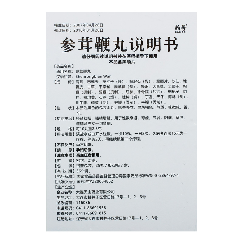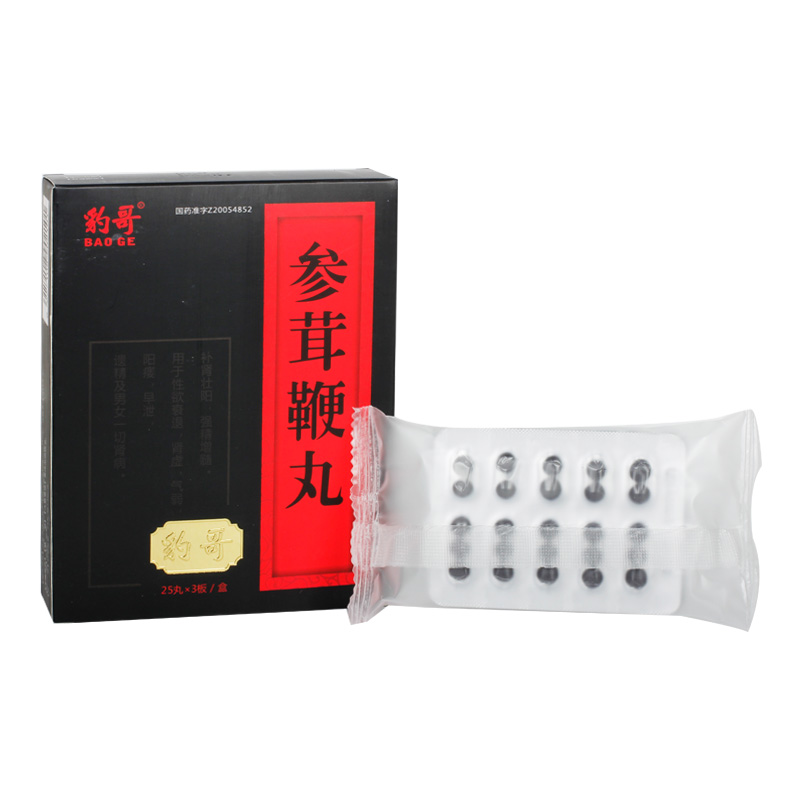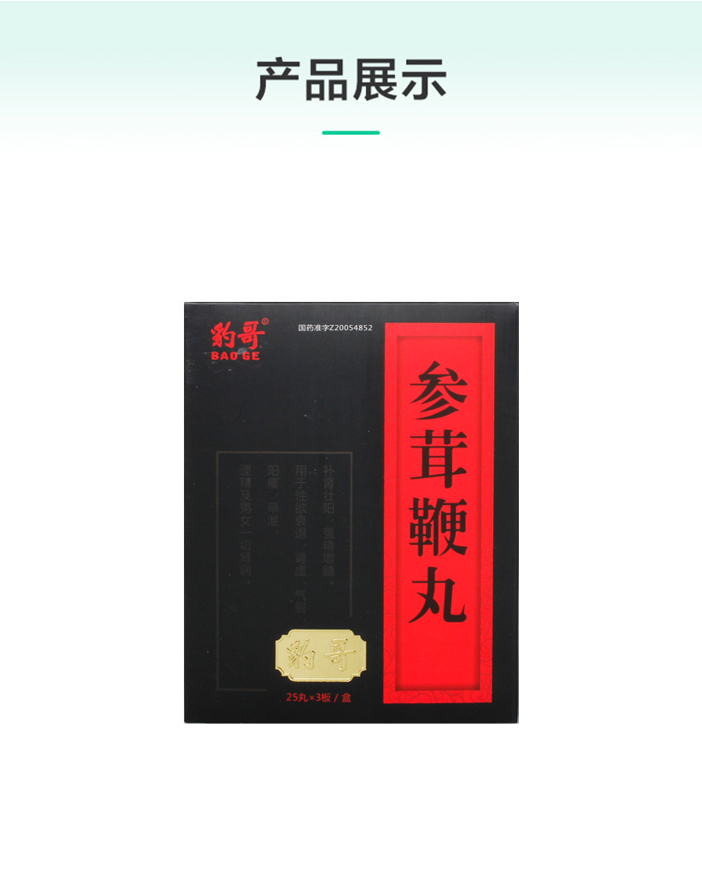 品牌 豹哥; 批準文號 國藥準字Z20054852; 套餐類型 標準裝; 生產企業 大連天山藥業有限公司; 產品劑型 丸劑; 用法 口服; 使用劑量 一次10丸,一日2次; 藥品通用名 參茸鞭丸; 藥品名稱 參茸鞭丸; 有效期 36個月; 適用人群 不限; 藥品類別 中藥; 藥品分類 處方藥; 疾病 性欲減退 陽痿早泄; 癥狀 遺精早泄; 藥品規格 75丸/盒;