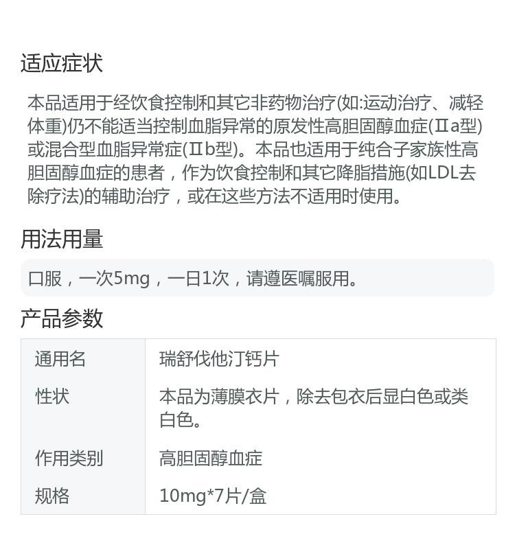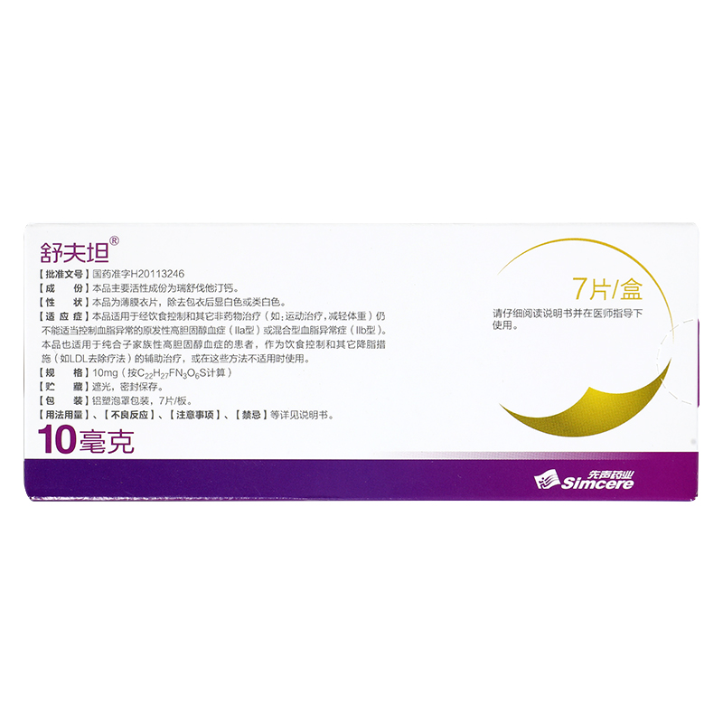品牌 舒夫坦; 批準文號 國藥準字H20113246; 套餐類型 標準裝; 生產企業 南京先聲東元制藥有限公司; 產品劑型 片劑; 用法 口服; 使用劑量 口服,起始劑量為每次1片,每日1次。; 藥品通用名 瑞舒伐他汀鈣片; 藥品名稱 瑞舒伐他汀鈣片; 有效期 24個月; 適用人群 成人; 藥品類別 化學藥; 藥品分類 處方藥; 疾病 混合型血脂異常癥 原發性高膽固醇血癥; 癥狀 高膽固醇血癥 血脂異常; 藥品規格 10mg*7片/盒;