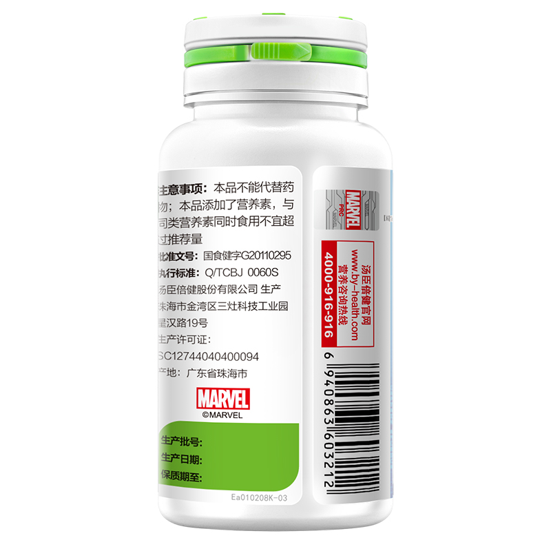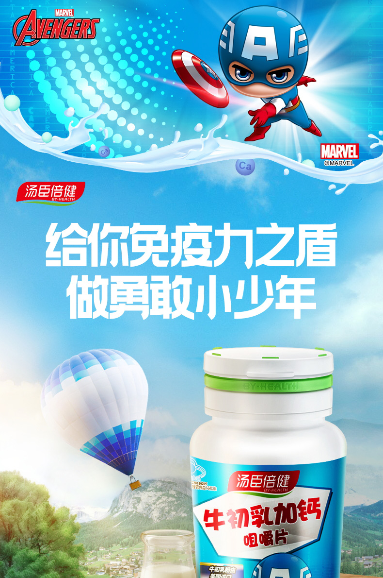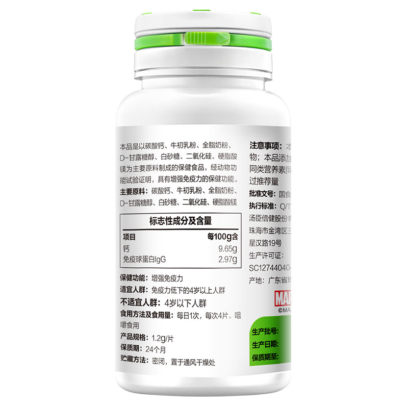 品牌 BY-HEALTH/湯臣倍健; 系列 牛初乳加鈣咀嚼片; 省份 廣東; 城市 珠海; 產地 中國大陸地區; 適用性別 通用; 保質期 24個月; 生產企業 湯臣倍健股份有限公司; 產品劑型 片劑; 規格(粒/袋/ml/g) 1.2g/片*60片; 計價單位 盒; 適用人群 兒童; 保健食品批準證號 國食健字G20110295; 是否保健食品(國食健字號) 是; 生產許可證編號 SC12744040400094; 廠名 湯臣倍健股份有限公司; 廠址 珠海市金灣區三灶科技工業園星漢路19號; 廠家聯系方式 4000-916-916; 保質期 730; 產品名稱 湯臣倍健R牛初乳加鈣咀嚼片; 功能 增強免疫力; 不適宜人群 4歲以下人群; 主要原料 碳酸鈣、牛初乳粉、全脂奶粉、D-甘露糖醇、白砂糖、二氧化硅、硬脂酸鎂; 功效成分/標志性成分含量 每100g含:鈣 9.65g、免疫球蛋白IgG 2.97g; 批準文號 國食健字G20110295; 注意事項 本品不能代替藥物;本品添加了營養素,與同類營養素同時食用不宜超過推薦量; 申請人中文名稱 湯臣倍健股份有限公司; 貯藏方法 密閉,置于通風干燥處; 適宜人群 免疫力低下的4歲以上人群; 食用方法和食用量 每日1次,每次4片,咀嚼食用;