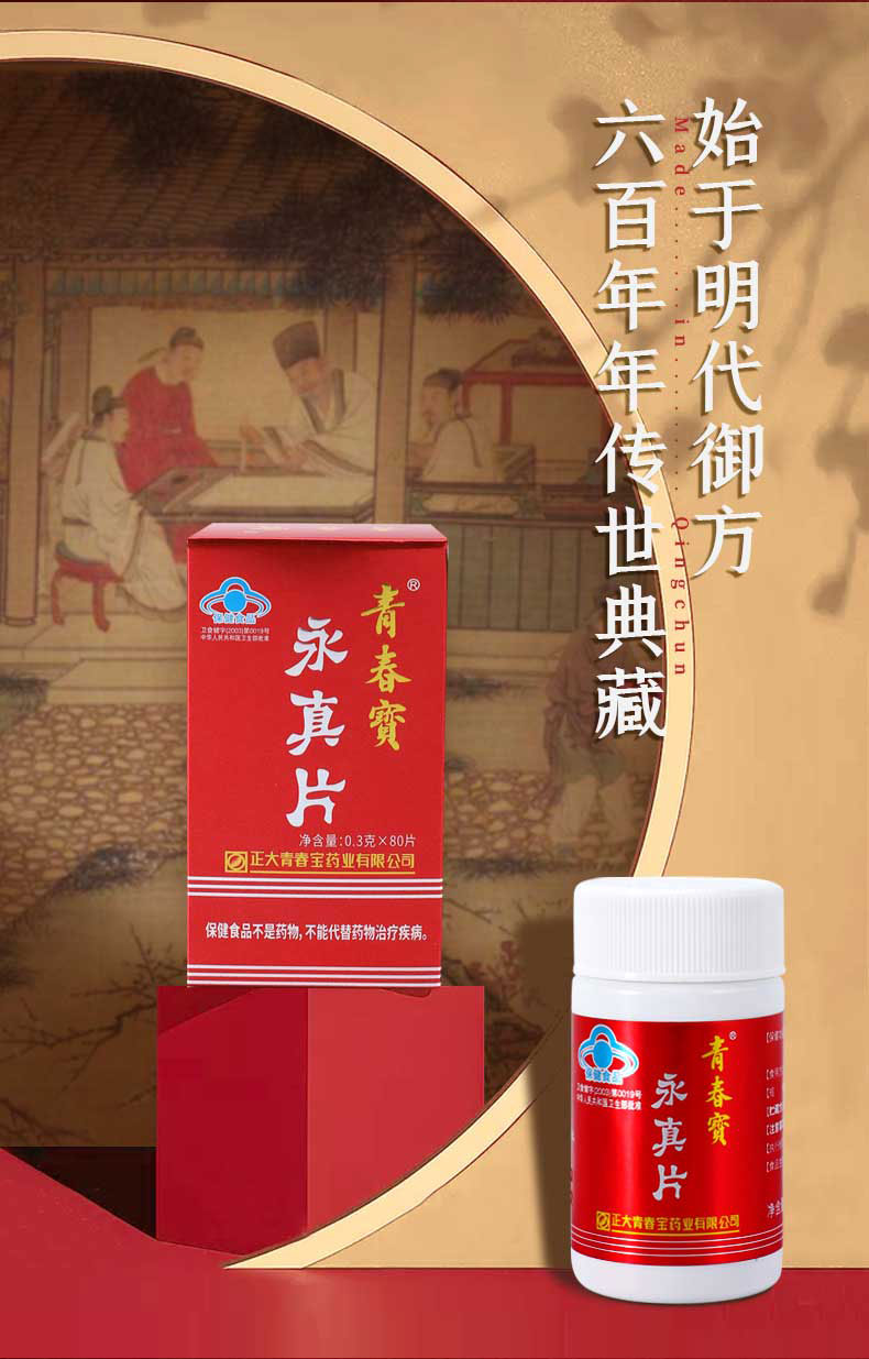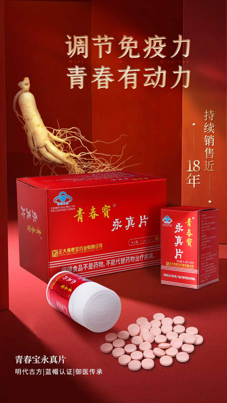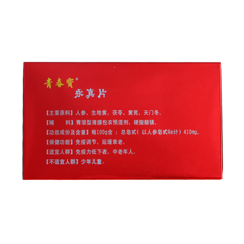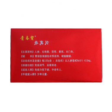 批準文號 衛食健字(2003)第0019號; 具體規格 0.3g/片*80片*6瓶; 品牌 青春寶; 是否進口 否; 產品劑型 片劑; 保健食品產品名稱 青春寶牌永真片; 保健功能 增強免疫力; 是否禮盒裝 否; 主要原料 人參、生地黃、茯苓、黃芪、天門冬; 適宜人群 免疫力低下者、中老年人; 不適宜人群 少年兒童; 廠名 正大青春寶(德清)藥業有限公司; 廠址 浙江省湖州市德清莫干山國家高新區青春路88號(阜溪); 廠家聯系方式 4008810303; 保質期 730; 產品名稱 青春寶牌永真片; 功能 免疫調節、延緩衰老; 功效成分/標志性成分含量 每100g含:總皂甙(以人參皂甙Re計)410mg; 注意事項 本品不能代替藥物; 申請人中文名稱 正大青春寶藥業有限公司; 貯藏方法 密封、置干燥處; 食用方法和食用量 每日2次,每次5片;