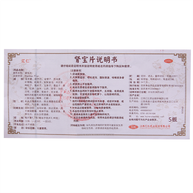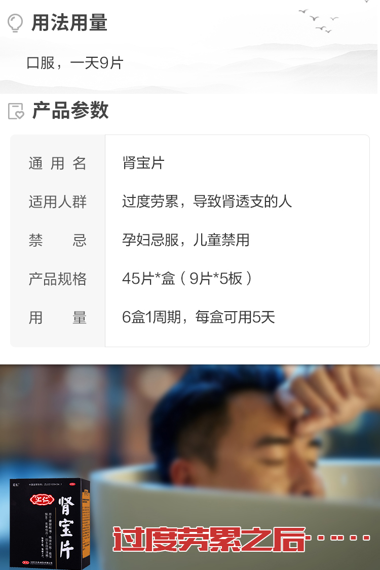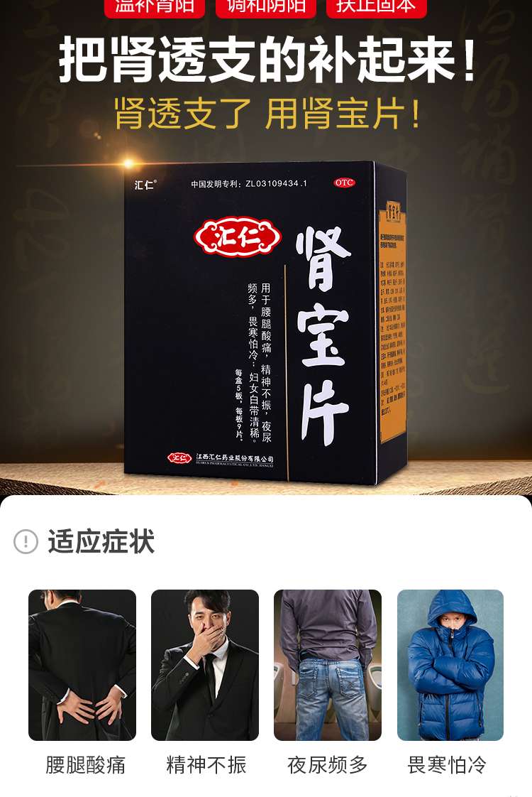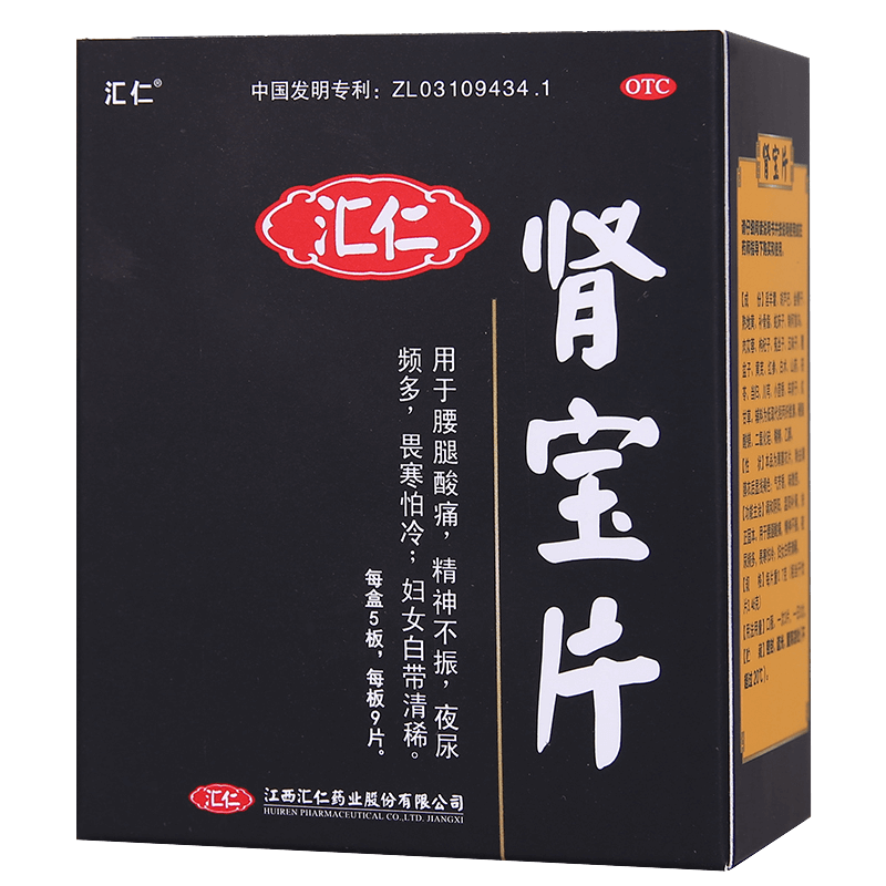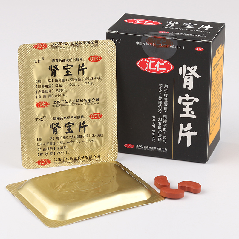 品牌 匯仁; 批準文號 國藥準字Z20080627; 套餐類型 標準裝 本品3盒裝; 生產企業 江西匯仁藥業股份有限公司; 規格 0.7g*45片/盒; 類別 中藥; 產品劑型 片劑; 用法 口服; 使用劑量 一日3次,一次3片; 藥品通用名 腎寶片; 藥品名稱 腎寶片; 有效期 24個月; 適用人群 成人; 疾病 腰腿疼痛; 癥狀 多夢 失眠 食欲減退 腰膝痠痛;