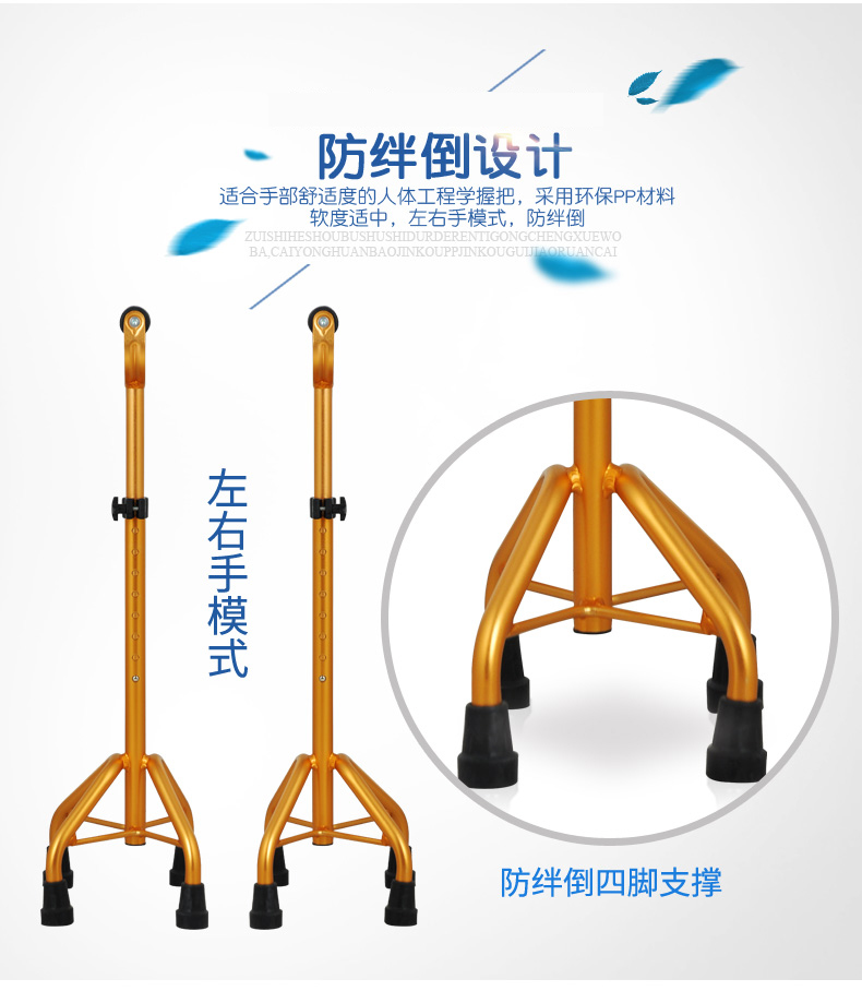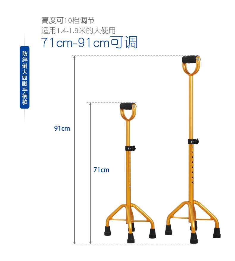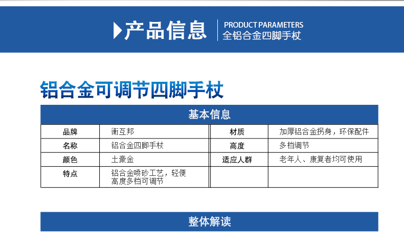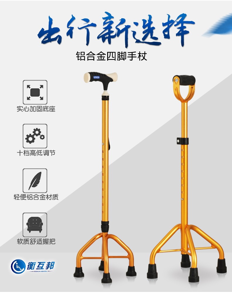 型號 GZ-G05; 品牌 衡互邦; 產地 河北; 顏色分類 一件; 生產企業 衡水多米諾醫療器械有限公司; 增值服務 無; 適用人群 老年; 選購熱點 四腳; 拐杖類別 四腳; 保健用品產品名稱 四腳手杖-金色大四角;