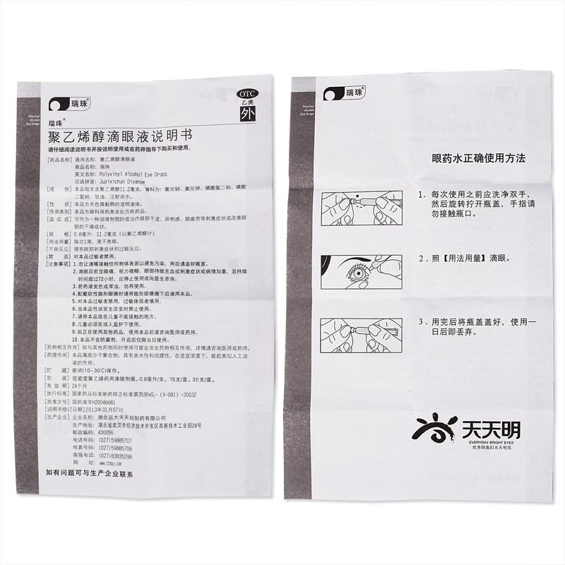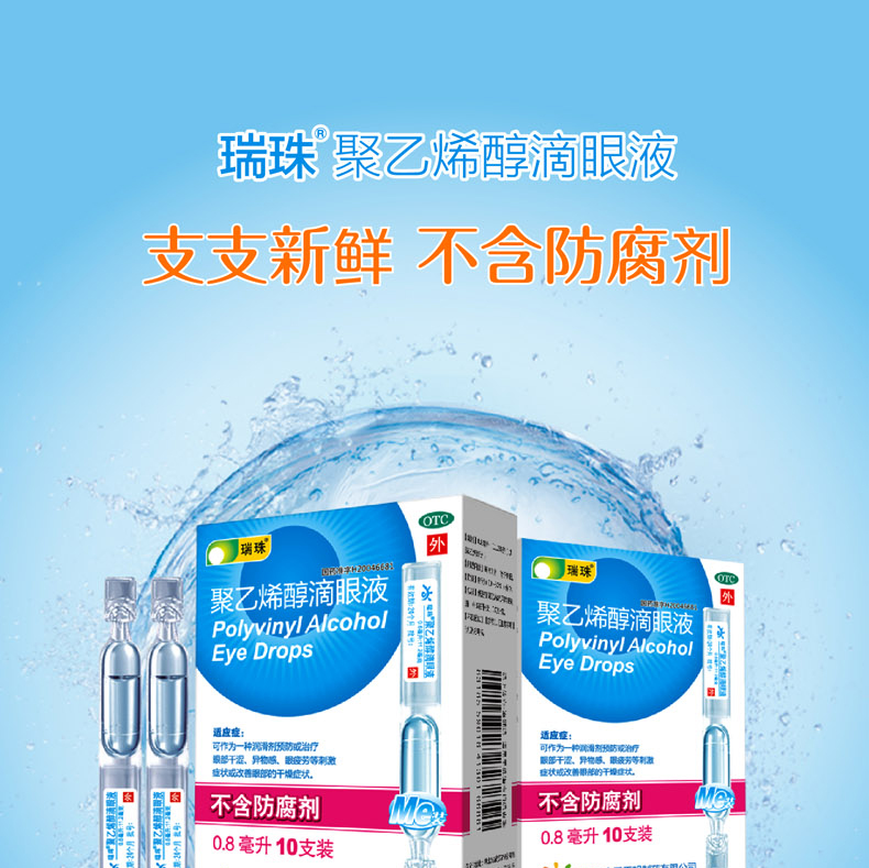 生產日期 2019年05月13日 至 2019年05月22日; 品牌 瑞珠; 批準文號 國藥準字H20046681; 套餐類型 標準裝0.8ml*10支/盒 【黃金搭檔 共50支】0.8ml*10支/盒+0.8ml*20支/盒*2盒 3盒量販裝0.8ml*10支/盒 【護眼升級版】瑞珠滴眼液10支+珍視明眼貼15片; 生產企業 湖北遠大天天明制藥有限公司; 規格 0.8ml*10支/盒; 類別 化學藥; 產品劑型 滴眼劑; 用法 滴眼; 使用劑量 一次一滴,滴于患眼; 藥品通用名 聚乙烯醇滴眼液; 藥品名稱 聚乙烯醇滴眼液; 有效期 24個月; 適用人群 不限; 藥品分類 非處方藥; 疾病 異物感 眼疲勞 眼部干澀 干眼癥 視力疲勞癥; 癥狀 異物感 眼疲勞 眼部干澀;