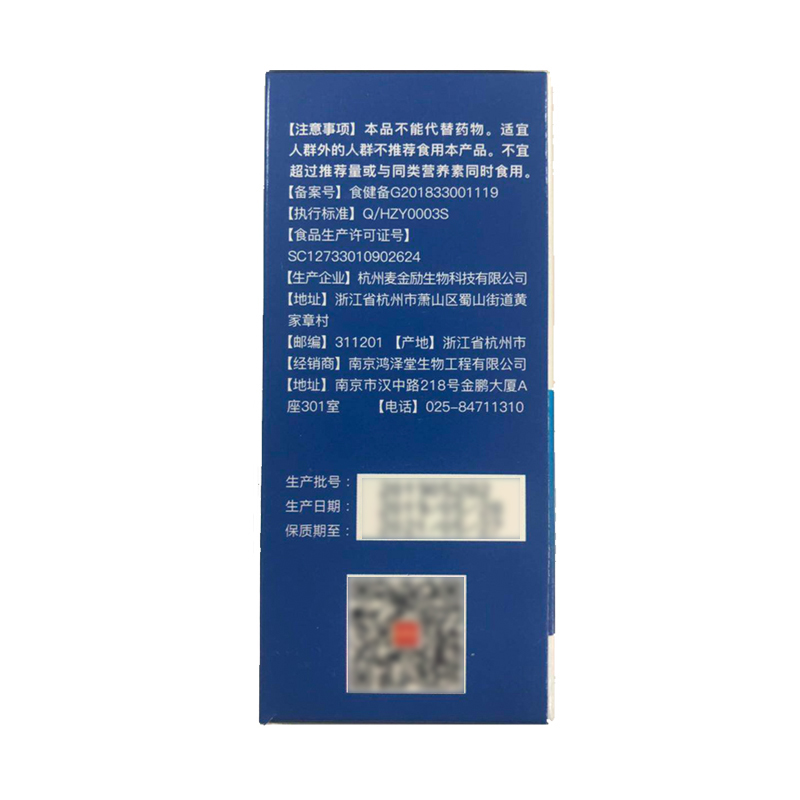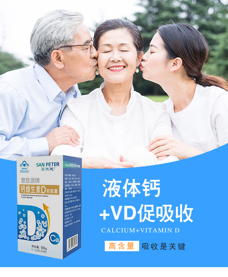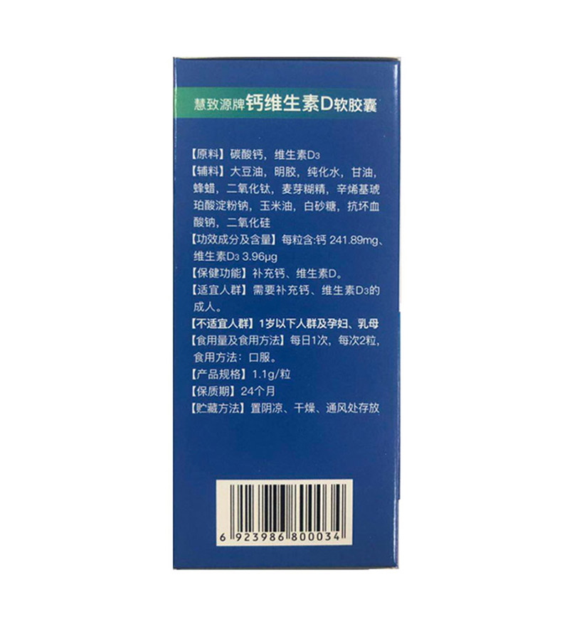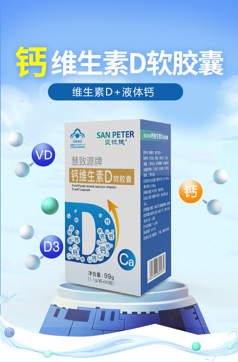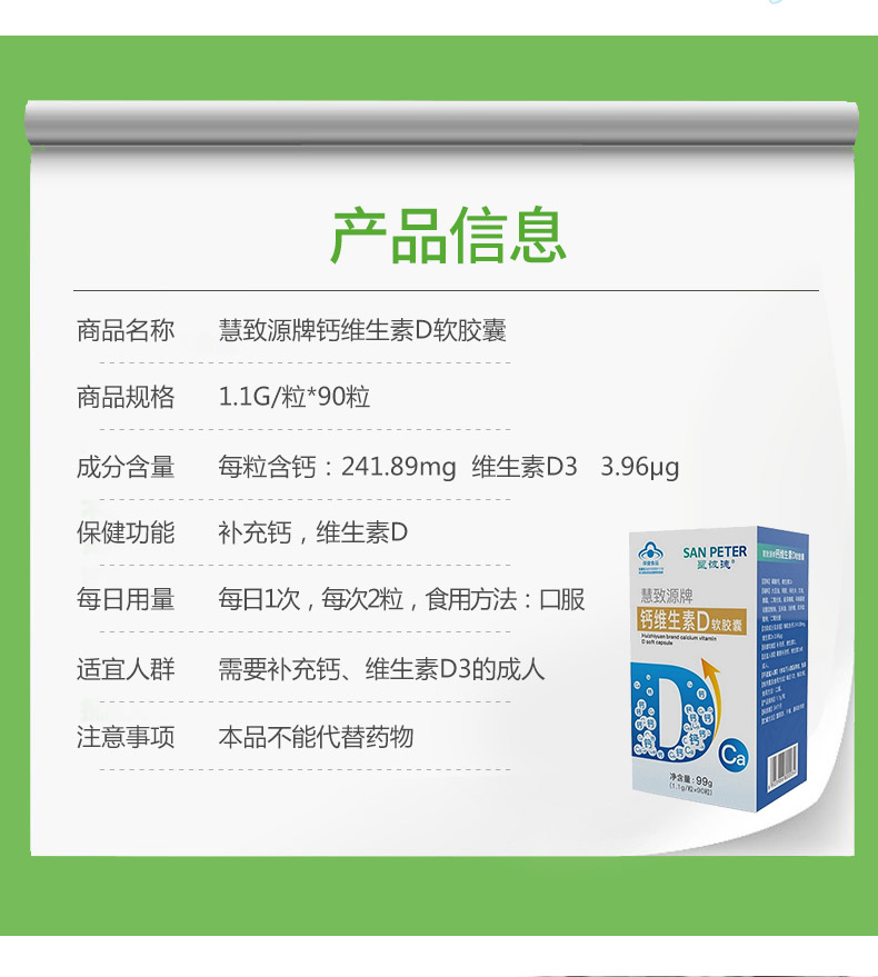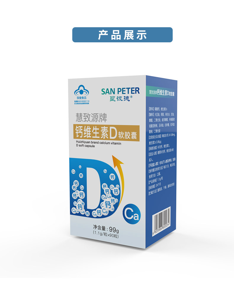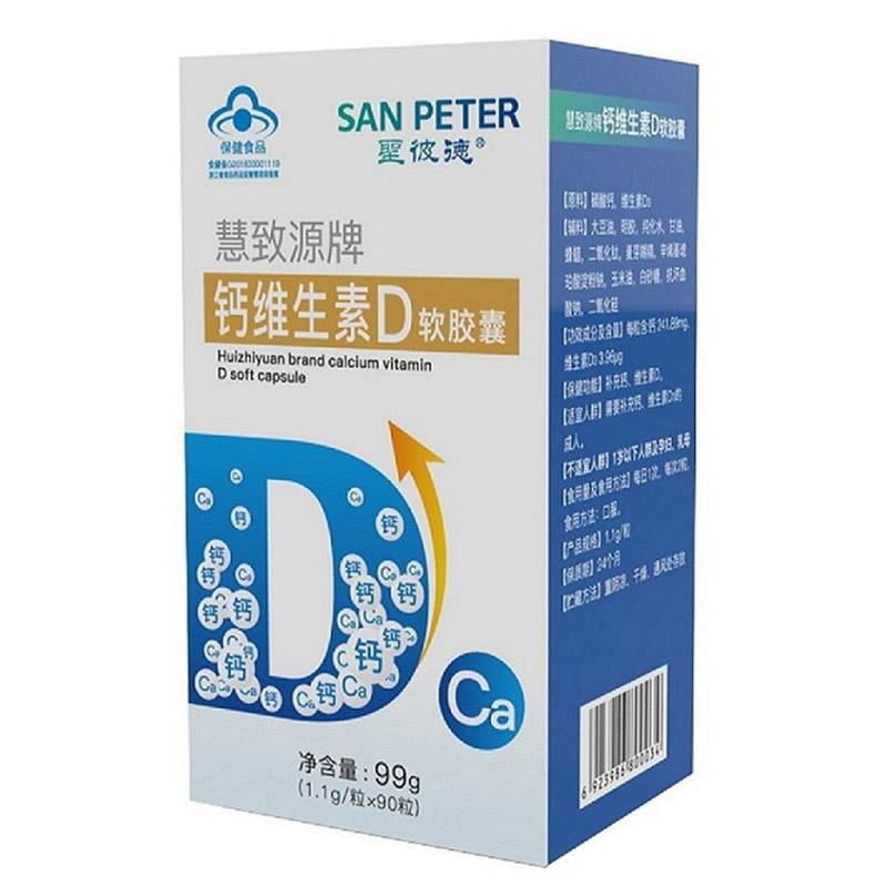 生產日期 2019年05月28日 至 2019年05月28日; 品牌 San Peter/圣彼德; 系列 慧致源牌鈣維生素D軟膠囊; 省份 其他; 產地 中國大陸地區; 適用性別 通用; 顏色分類 1盒裝 3盒裝 1盒 3盒; 保質期 24個月; 生產企業 杭州麥金勵生物科技有限公司; 產品劑型 膠囊; 規格(粒/袋/ml/g) 1.1g/粒*90粒; 計價單位 瓶; 適用人群 成人; 保健食品批準證號 食健備G201833001119; 是否保健食品(國食健字號) 是; 生產許可證編號 SC12733010902624; 廠名 杭州麥金勵生物科技有限公司; 廠址 浙江省杭州市蕭山區蜀山街道黃家章村; 廠家聯系方式 4006600518; 保質期 730; 產品名稱 慧致源牌鈣維生素D軟膠囊; 功能 補充鈣、維生素D; 不適宜人群 1歲以下人群及孕婦、乳母; 主要原料 碳酸鈣,維生素D3; 功效成分/標志性成分含量 每粒含:鈣241.89mg、維生素D3 3.96 μg; 受讓方 杭州麥金勵生物科技有限公司; 批準文號 食健備G201833001119; 注意事項 本品不能代替藥物。適宜人群外的人群不推薦食用本產品。不宜超過推薦量或與同類營養素同時食用; 申請人中文名稱 杭州麥金勵生物科技有限公司; 貯藏方法 置陰涼、干燥、通風處存放;