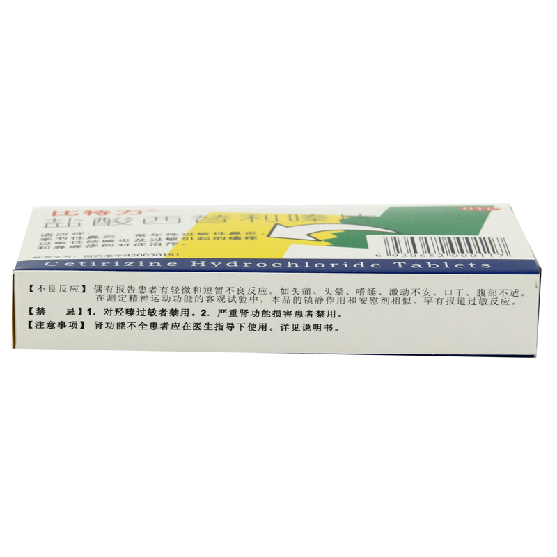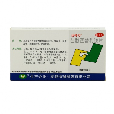 生產日期 2019年03月16日 至 2019年04月23日; 品牌 比特力; 批準文號 國藥準字H20030191; 套餐類型 本品5盒 本品10盒 本品1盒; 生產企業 成都恒瑞制藥有限公司; 規格 10mg*6片/盒; 類別 化學藥; 產品劑型 片劑; 用法 口服; 使用劑量 詳見說明書; 藥品通用名 鹽酸西替利嗪片; 藥品商品名 比特力; 藥品名稱 比特力 鹽酸西替利嗪片; 有效期 24個月; 適用人群 不限; 藥品分類 非處方藥; 疾病 瘙癢 蕁麻疹 常年性過敏性鼻炎 過敏性結膜炎 過敏性鼻炎 鼻炎; 癥狀 瘙癢 流涕 鼻塞 鼻癢;