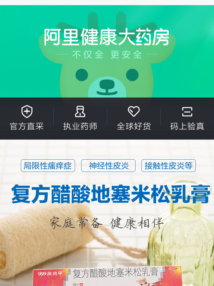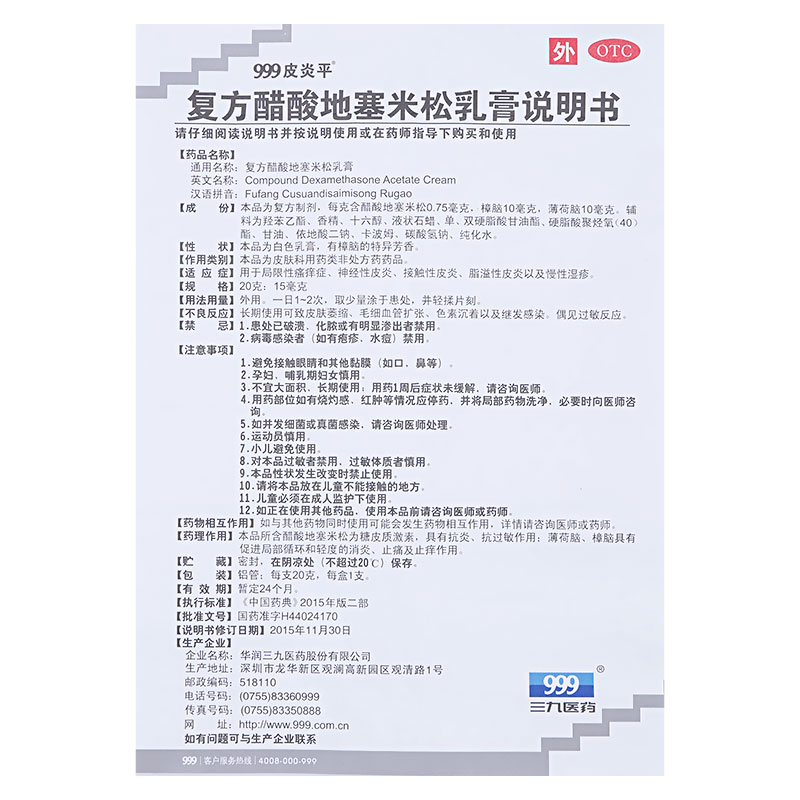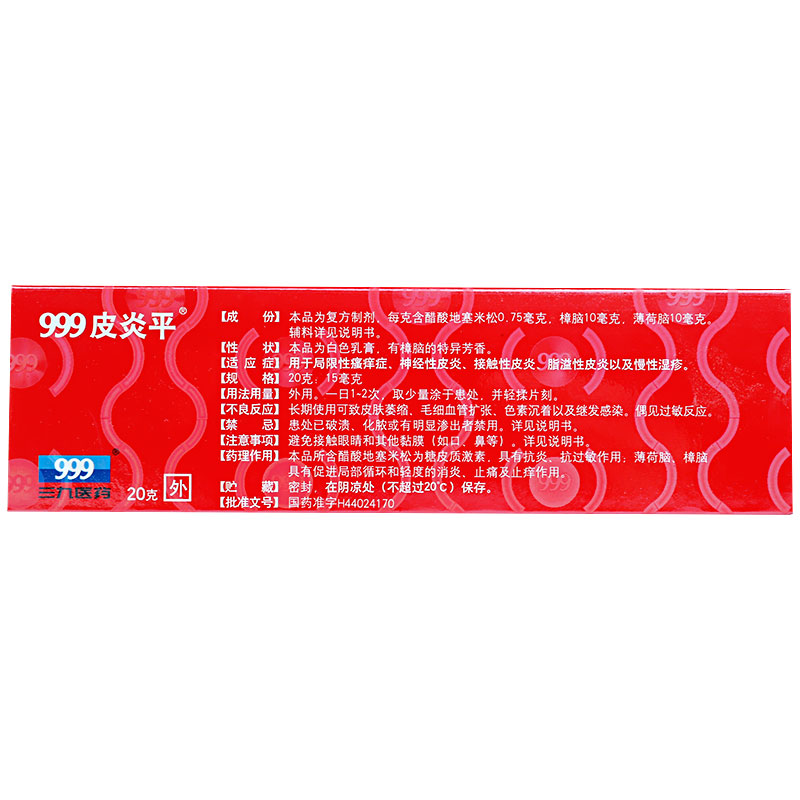 生產日期 2018年12月27日 至 2019年05月27日; 品牌 999皮炎平; 批準文號 國藥準字H44024170; 套餐類型 標準裝1盒 本品3盒裝 本品5盒裝 本品3盒 + 爐甘石洗劑 本品1盒 + 爐甘石洗劑 本品1盒 + 紅霉素軟膏; 規格 20g:15mg*1支/盒; 生產企業 華潤三九醫藥股份有限公司; 產品劑型 軟膏劑; 用法 皮膚外用; 使用劑量 一日1~2次,取少量涂于患處,并輕揉片刻。; 藥品通用名 復方醋酸地塞米松乳膏; 藥品名稱 復方醋酸地塞米松乳膏; 有效期 24個月; 適用人群 不限; 藥品類別 復方制劑; 藥品分類 非處方藥; 疾病 皮炎; 癥狀 瘙癢;