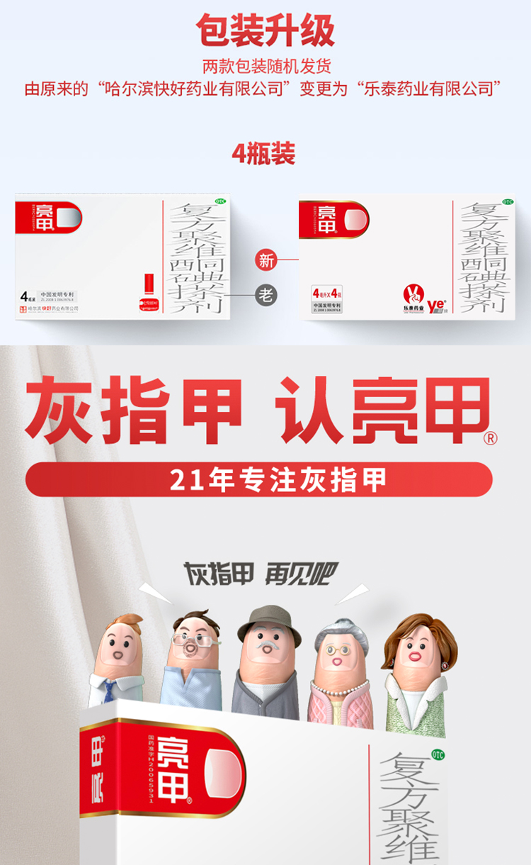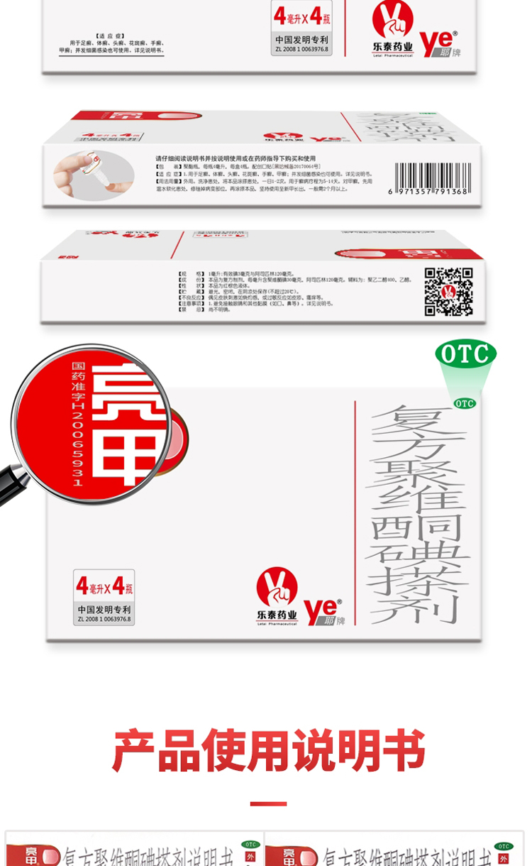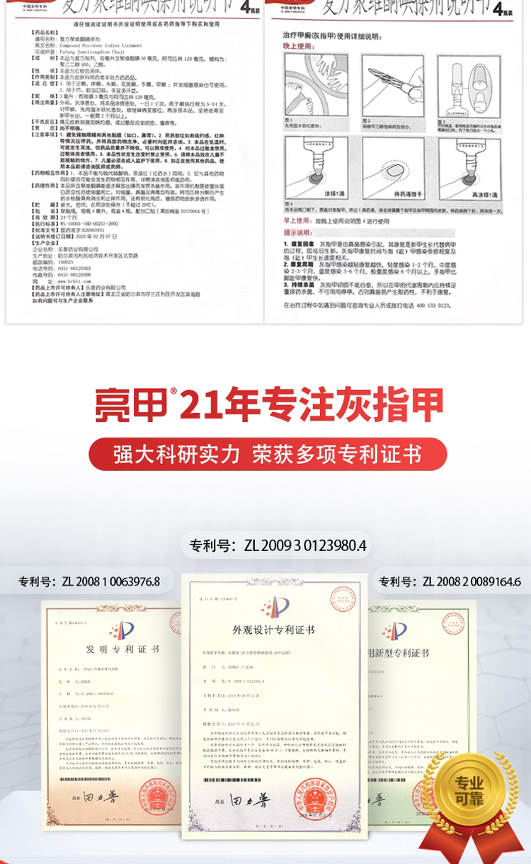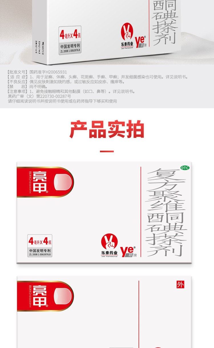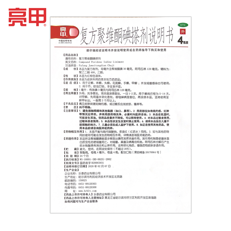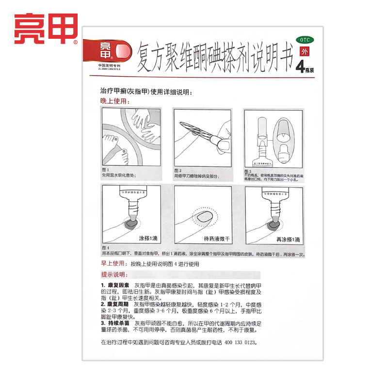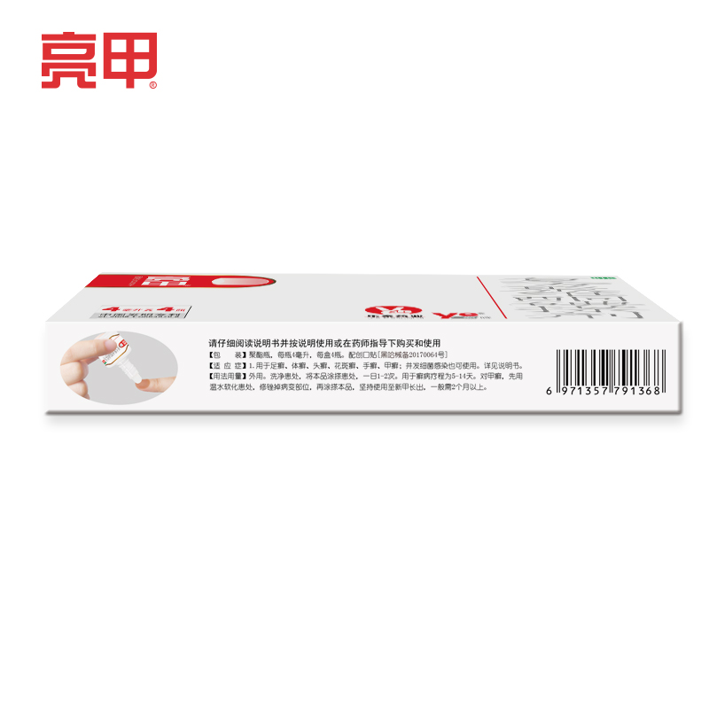 品牌 亮甲; 批準文號 國藥準字H20065931; 套餐類型 標準裝; 規格 4ml*4瓶/盒; 生產企業 樂泰藥業有限公司; 產品劑型 外用液體劑; 用法 皮膚外用; 使用劑量 詳見說明書; 藥品通用名 復方聚維酮碘搽劑; 藥品名稱 復方聚維酮碘搽劑; 有效期 24個月; 適用人群 不限; 藥品類別 復方制劑; 疾病 甲癬 體癬 頭癬 手足癬; 癥狀 體癬 手足癬;