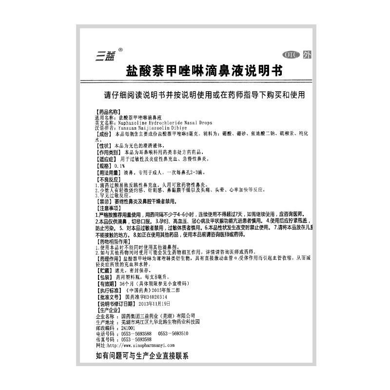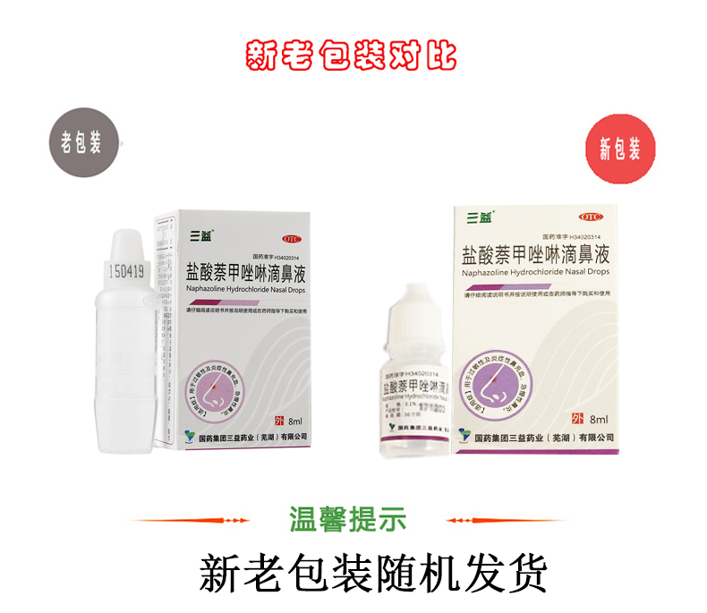 生產日期 2019年04月16日 至 2019年07月03日; 品牌 三益; 藥品名稱 鹽酸萘甲唑啉滴鼻液; 規格 0.1%8ml*1支/盒; 產品劑型 滴鼻劑; 用法 滴鼻; 疾病 鼻炎; 癥狀 鼻出血; 藥品分類 非處方藥; 適用人群 成人; 類別 化學藥; 套餐類型 3盒原品+開瑞坦氯雷他定片12片 5盒優惠裝 標準裝1盒 本品1盒+鼻朗生理海水鼻腔噴霧器60ml; 使用劑量 一次每鼻孔2~3滴; 批準文號 國藥準字H34020314; 藥品通用名 鹽酸萘甲唑啉滴鼻液; 生產企業 國藥集團三益藥業(蕪湖)有限公司; 有效期 36個月;