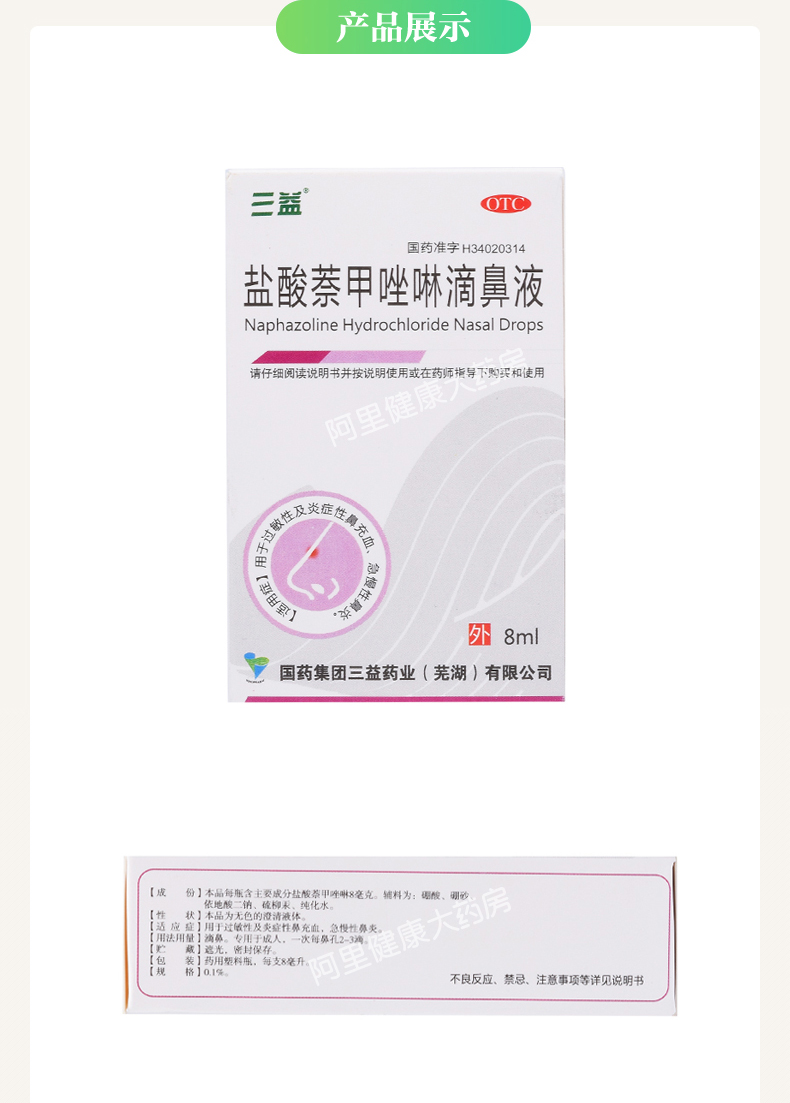 • 商品名称:三益鹽酸萘甲唑啉滴鼻液滴鼻劑0.1%8ml/支急慢性鼻炎鼻竇炎過敏性