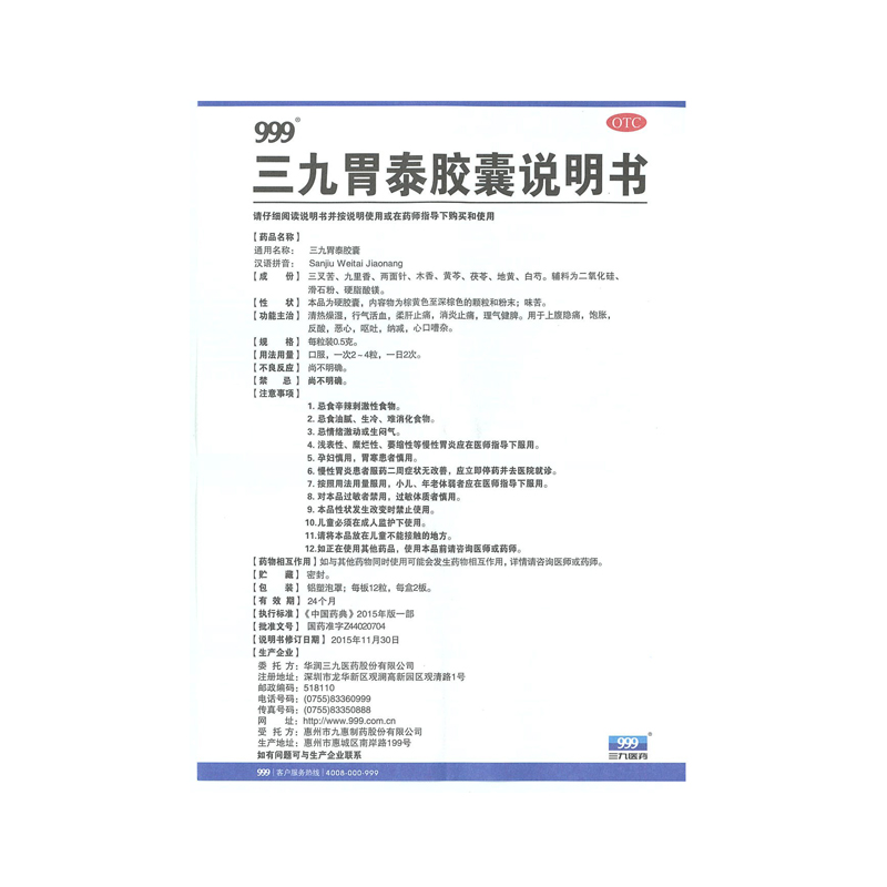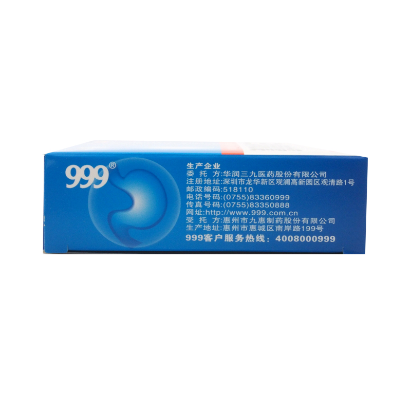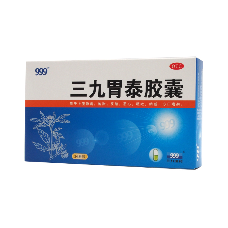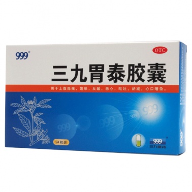 品牌 999; 批準文號 國藥準字Z44020704; 套餐類型 標準裝 本品3盒裝 本品2盒裝; 生產企業 華潤三九醫藥股份有限公司; 規格 0.5g*24粒/盒; 類別 中藥; 產品劑型 膠囊; 用法 口服; 使用劑量 一次2-4粒,一日2次; 藥品通用名 三九胃泰膠囊; 藥品名稱 三九胃泰膠囊; 有效期 24個月; 適用人群 不限; 藥品分類 非處方藥; 疾病 胃炎 行氣活血 嘔吐 清熱燥濕 惡心 反酸 柔肝止痛 上腹隱痛 飽脹 納減 心口嘈雜; 癥狀 腹脹 胃痛 腹痛 嘔吐 惡心 反酸 胃不適 上腹隱痛 飽脹 納減 心口嘈雜;