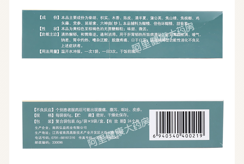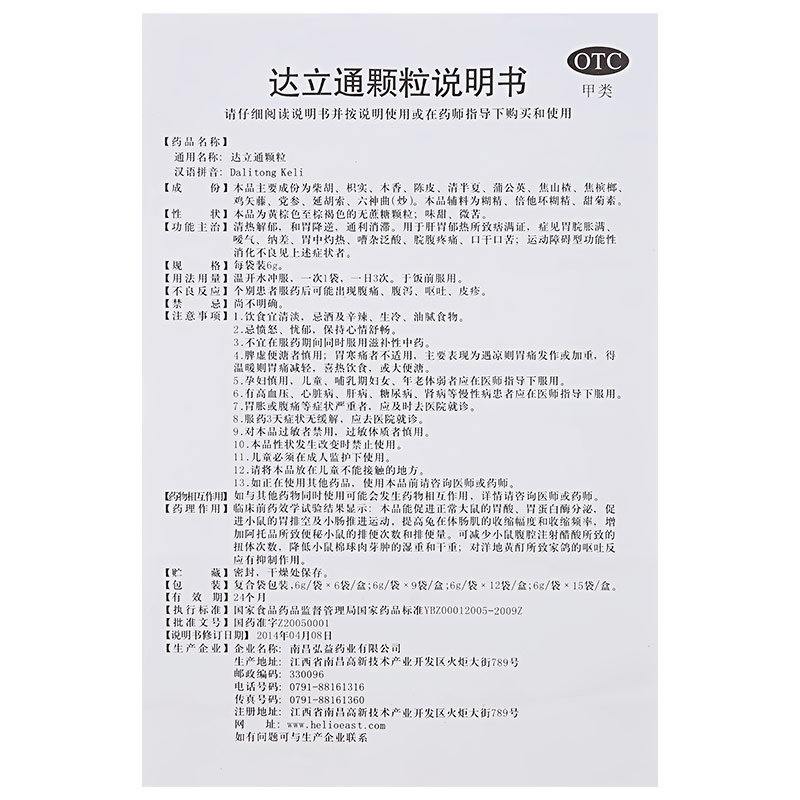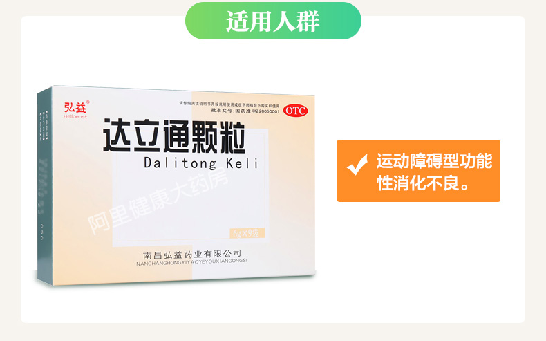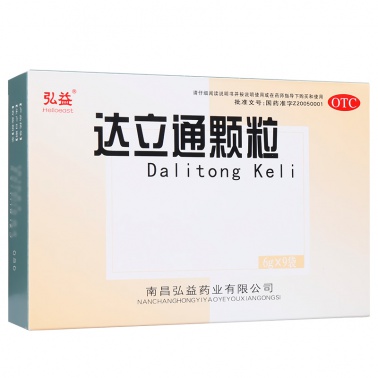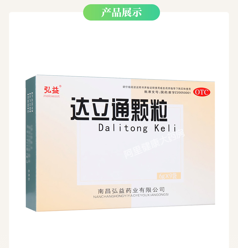 品牌 Helioeast; 批準文號 國藥準字Z20050001; 套餐類型 本品1盒 本品3盒 優惠裝 節省1.5元+包郵 本品5盒 特惠裝 立省5元; 生產企業 南昌弘益藥業有限公司; 規格 6g*9袋/盒; 類別 中藥; 產品劑型 顆粒; 用法 口服; 使用劑量 溫開水沖服,一次1袋,1日3次。與飯前服用。; 藥品通用名 達立通顆粒; 藥品名稱 達立通顆粒; 有效期 24個月; 適用人群 不限; 藥品分類 非處方藥; 疾病 噯氣 納差 胃脘脹滿 脘腹疼痛 口干口苦 和胃降逆 嘈雜泛酸 消化不良 清熱解郁 痞滿證 胃中灼熱 通利消滯; 癥狀 噯氣 胃脘脹滿、噯氣、納差、胃中灼熱、嘈雜泛酸、脘腹疼痛、口干口苦 口干口苦 和胃降逆 嘈雜泛酸 消化不良 清熱解郁 痞滿證 納差 胃中灼熱 胃脹 胃脘脹滿 脘腹疼痛 腹痛 通利消滯;