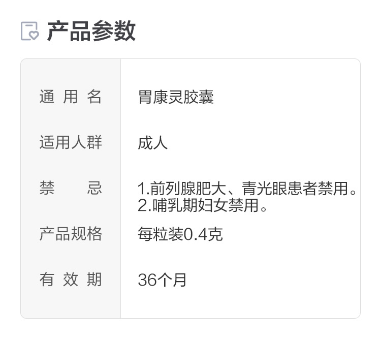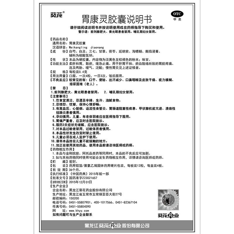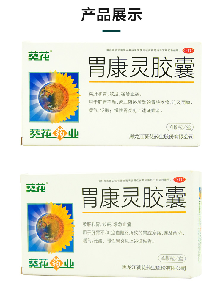 品牌 葵花; 批準文號 國藥準字Z23021657; 套餐類型 【1盒】 本品3盒裝 本品2盒裝; 生產企業 黑龍江葵花藥業股份有限公司; 規格 0.4g*48粒/盒; 類別 中藥; 產品劑型 膠囊; 用法 口服; 使用劑量 口服。一次4粒,一日3次。飯后服用; 藥品通用名 胃康靈膠囊; 藥品商品名 胃康靈膠囊; 藥品名稱 胃康靈膠囊; 有效期 36個月; 適用人群 成人; 藥品分類 非處方藥; 疾病 胃酸過多 脾胃不和; 癥狀 胃脘疼痛 泛酸 噯氣;