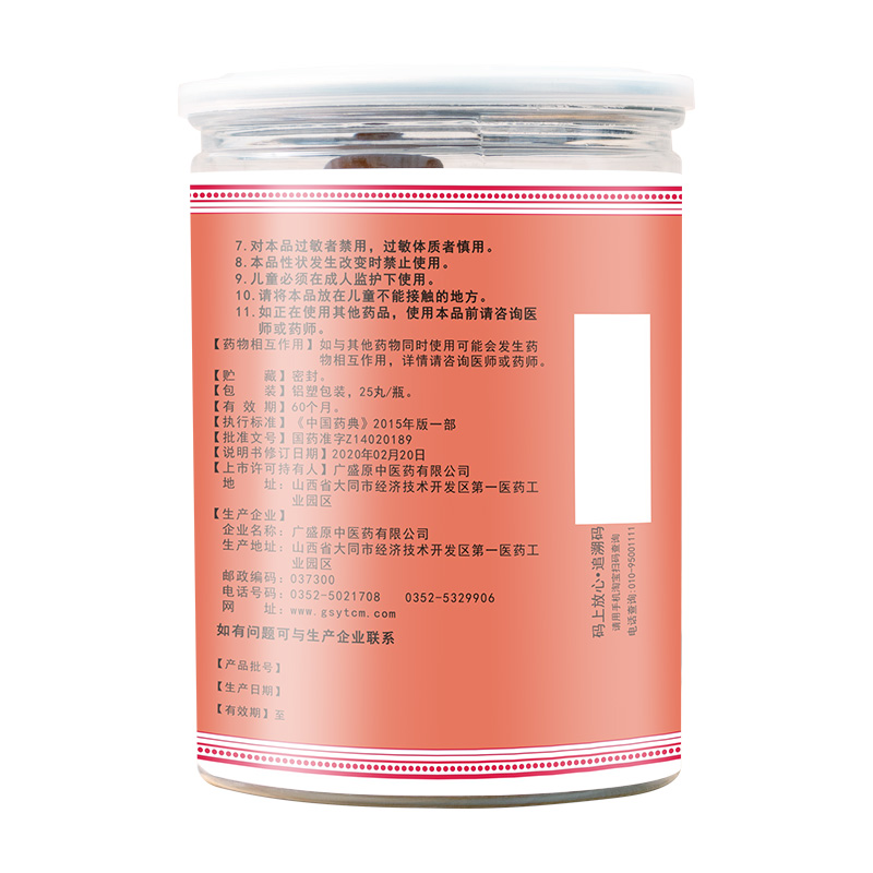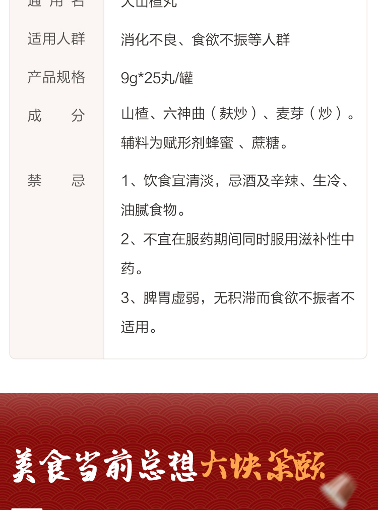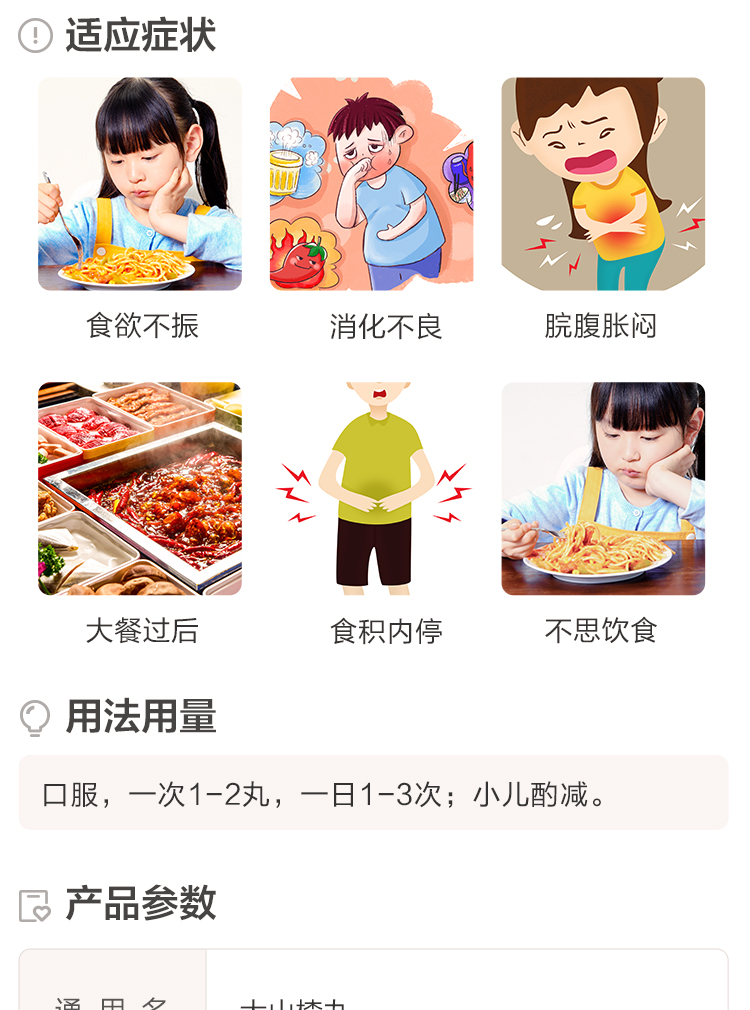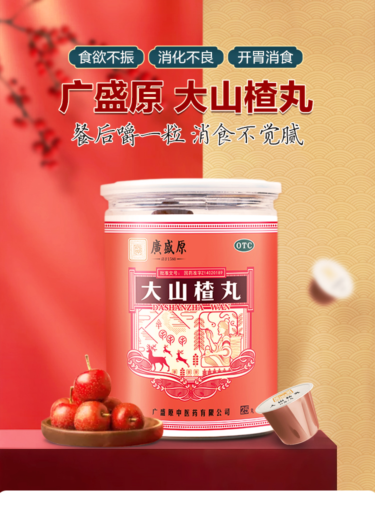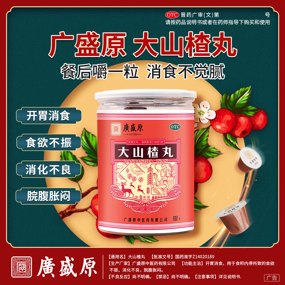 品牌 廣盛原; 批準文號 國藥準字Z14020189; 套餐類型 標準裝 本品3瓶裝 本品2瓶裝; 生產企業 廣盛原中醫藥有限公司; 規格 9g*25丸/瓶; 類別 中藥; 產品劑型 丸劑; 用法 口服; 使用劑量 口服,一次1~2丸,一日1~3次;小兒酌減。; 藥品通用名 大山楂丸; 藥品名稱 大山楂丸; 有效期 60個月; 適用人群 不限; 疾病 消化不良; 癥狀 食欲不振;