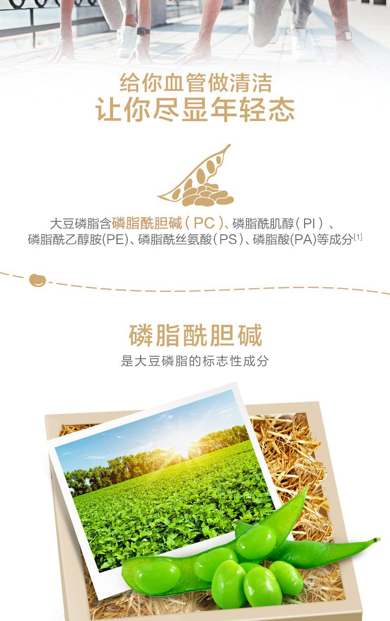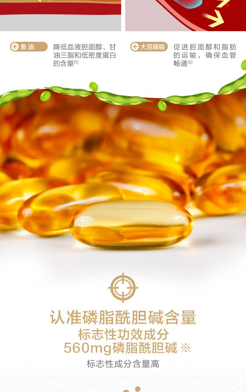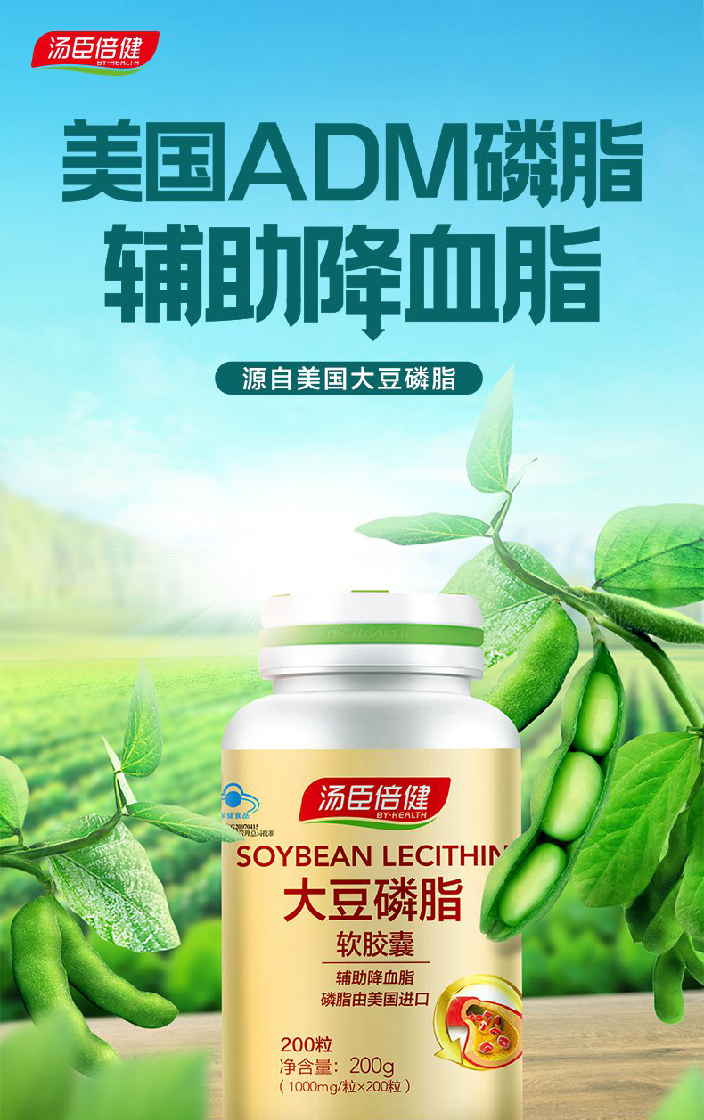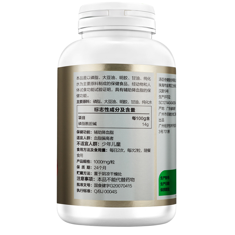 品牌 BY-HEALTH/湯臣倍健; 系列 大豆磷脂軟膠囊; 省份 廣東; 城市 珠海; 產地 中國大陸地區; 適用性別 通用; 保質期 24個月; 生產企業 湯臣倍健股份有限公司; 產品劑型 膠囊; 規格(粒/袋/ml/g) 1000mg/粒*200粒; 計價單位 瓶; 適用人群 中老年; 保健食品批準證號 國食健字G20070415; 是否保健食品(國食健字號) 是; 生產許可證編號 SC12744040400094; 廠名 湯臣倍健股份有限公司; 廠址 珠海市金灣區三灶科技工業園星漢路19號; 廠家聯系方式 4000-916-916; 保質期 730; 產品名稱 大豆磷脂軟膠囊; 功能 輔助降血脂; 不適宜人群 少年兒童; 主要原料 磷脂、大豆油、明膠、甘油、純化水; 功效成分/標志性成分含量 每100g含:磷脂酰膽堿 14g; 批準文號 國食健字G20070415; 注意事項 本品不能代替藥物; 申請人中文名稱 廣州市佰健生物工程有限公司; 貯藏方法 置于陰涼干燥處; 適宜人群 血脂偏高者; 食用方法和食用量 每日2次,每次2粒,隨餐食用;