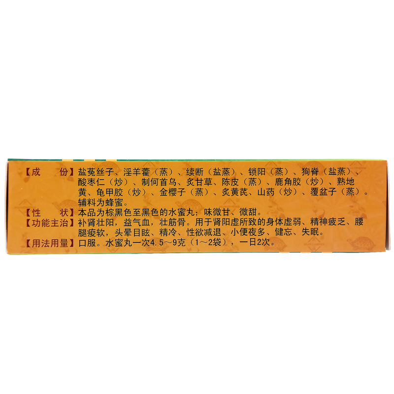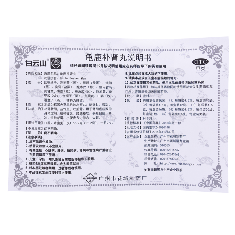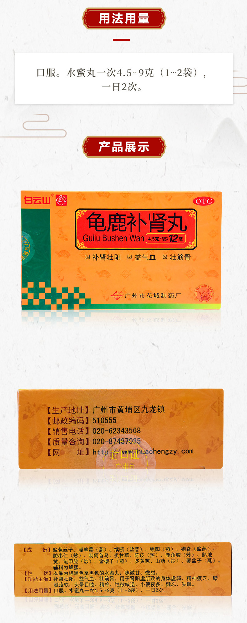 生產日期 2019年02月11日 至 2019年04月28日; 品牌 花城; 批準文號 國藥準字Z44020148; 套餐類型 【療程裝】5盒 優惠裝|包郵 【體驗裝】1盒12袋,一次(1~2袋),一日2次 【陽痿不育】本品5盒+同仁堂五子衍宗丸60g*6盒 【遺精早泄】本品5盒+同仁堂鎖陽固精丸10丸*6盒 【前列腺增生】本品5盒+普樂安膠囊120粒*3盒 【陰陽兩虛】本品5盒+九芝堂六味地黃丸360粒*2盒 【補腦助眠】本品4盒+敖東安神補腦液40支 本品2盒裝 【特惠裝】3盒12袋,一次(1~2袋),一日2次; 生產企業 廣州花城藥業有限公司; 規格 4.5g*12袋/盒; 類別 中藥; 產品劑型 丸劑; 用法 口服; 使用劑量 一次4.5~9克(1~2袋),一日2次; 藥品通用名 龜鹿補腎丸; 藥品商品名 花城; 藥品名稱 龜鹿補腎丸; 有效期 24個月; 適用人群 成人; 藥品分類 非處方藥; 疾病 腎陽虛; 癥狀 頭暈目眩;