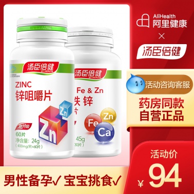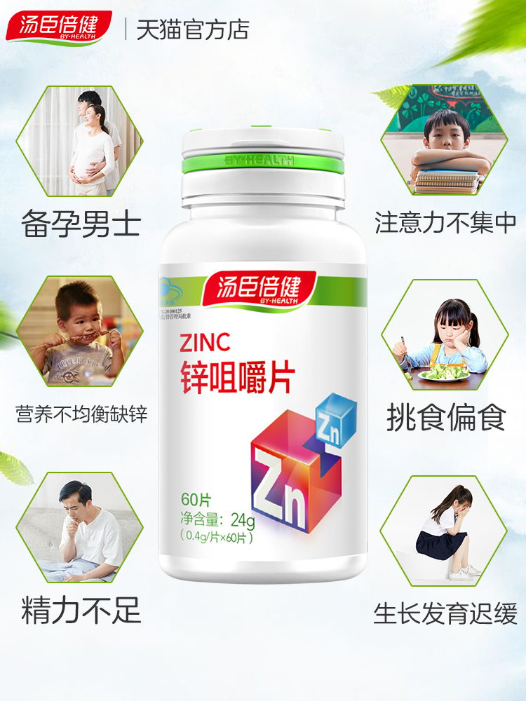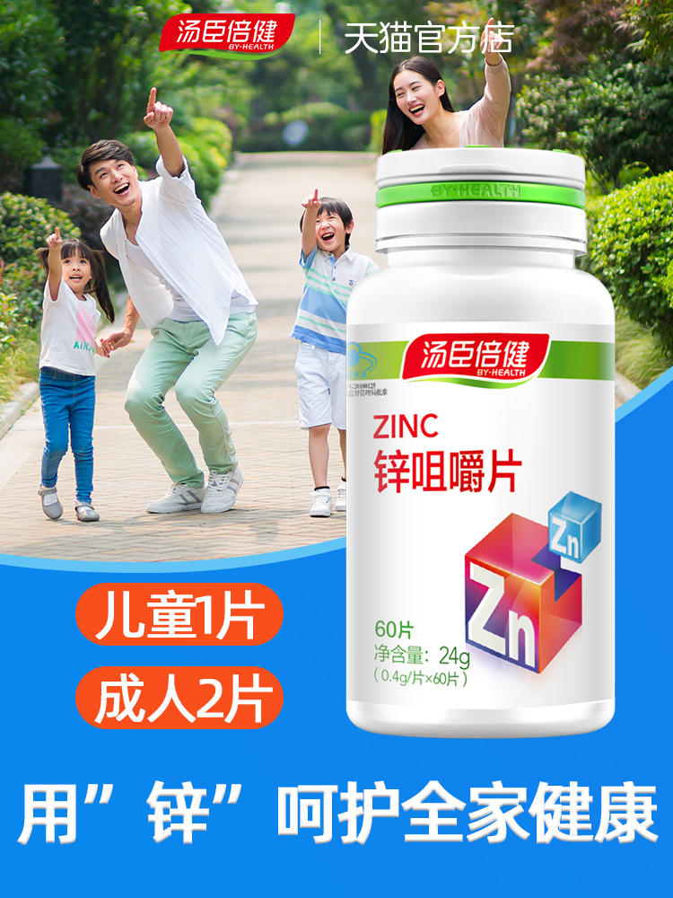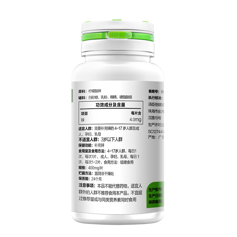 品牌 BY-HEALTH/湯臣倍健; 系列 鋅咀嚼片; 省份 其他; 產地 中國大陸地區; 適用性別 通用; 保質期 24個月; 生產企業 湯臣倍健股份有限公司(原廣東湯臣倍健生物科技); 產品劑型 片劑; 規格(粒/袋/ml/g) 0.4g/片*60片; 計價單位 瓶; 適用人群 不限; 保健食品批準證號 食健備G201844000382; 是否保健食品(國食健字號) 是; 生產許可證編號 SC12744040400094; 廠名 湯臣倍健股份有限公司; 廠址 珠海市金灣區三灶科技工業園星漢路19號; 廠家聯系方式 4000916916; 保質期 730; 產品名稱 湯臣倍健R鋅咀嚼片; 功能 補充鋅; 不適宜人群 無; 主要原料 檸檬酸鋅、白砂糖、全脂乳粉、糊精、硬脂酸鎂; 功效成分/標志性成分含量 每片含:鋅 4.56mg; 批準文號 國食健字G20100125; 注意事項 本品不能代替藥物;不宜超過推薦量或與同類營養素補充劑同時食用; 申請人中文名稱 廣東湯臣倍健生物科技股份有限公司; 貯藏方法 置陰涼干燥處; 適宜人群 需要補充鋅的4-10歲兒童及成人; 食用方法和食用量 4-10歲兒童:每日1次,每次1片;成人:每日1次,每次2片;咀嚼食用;