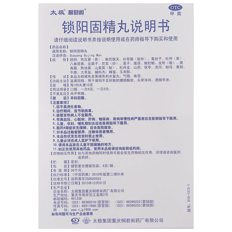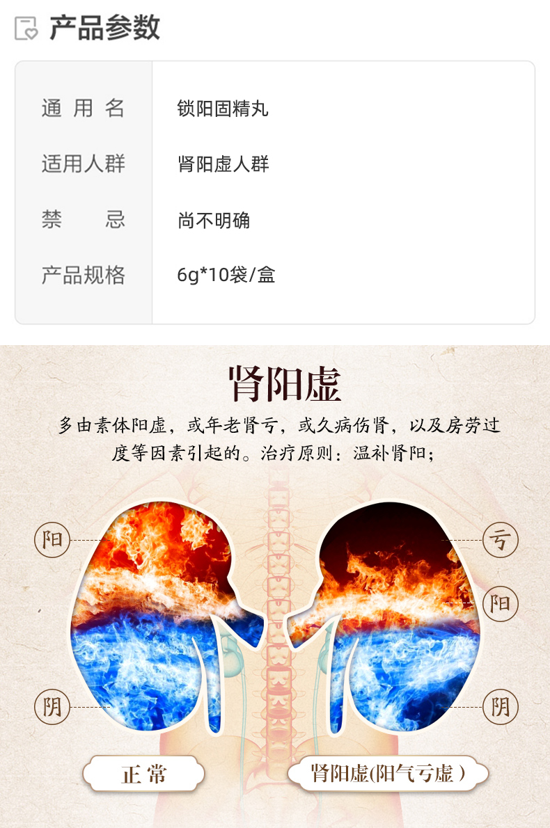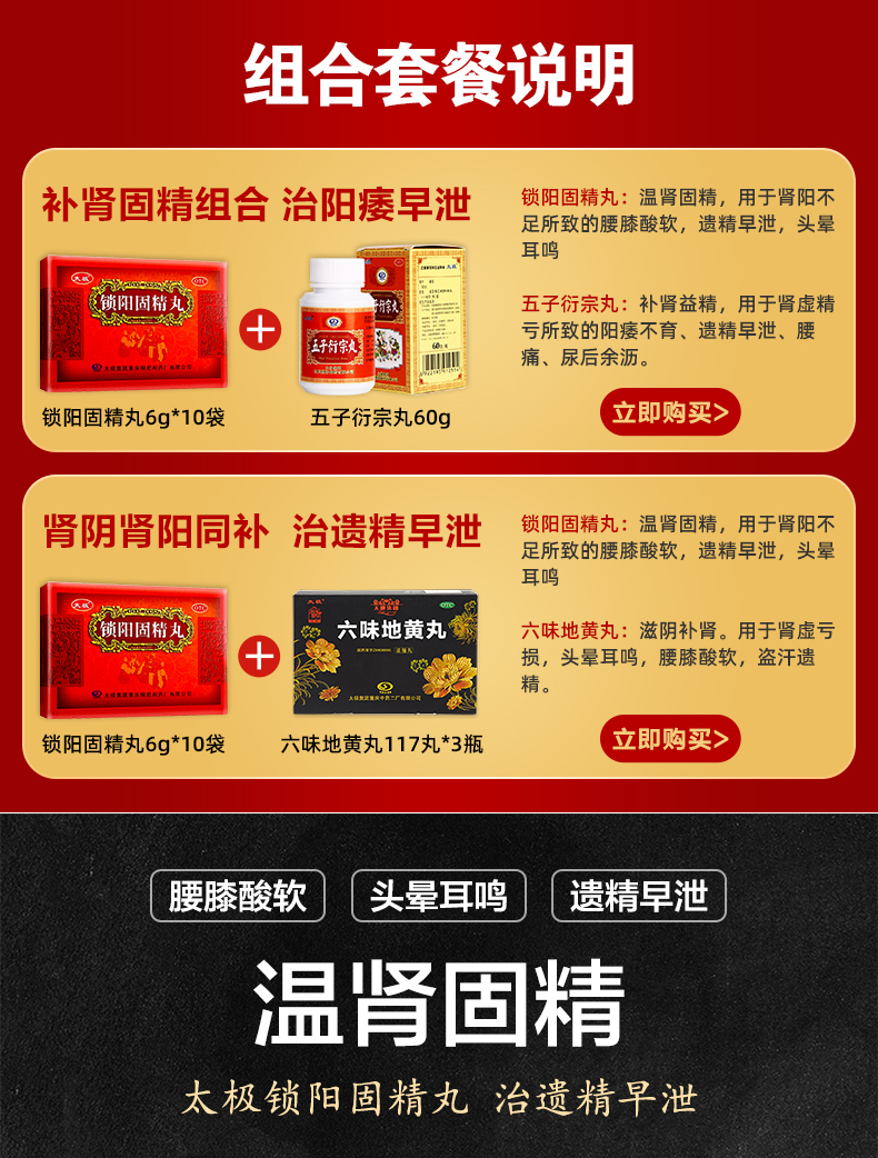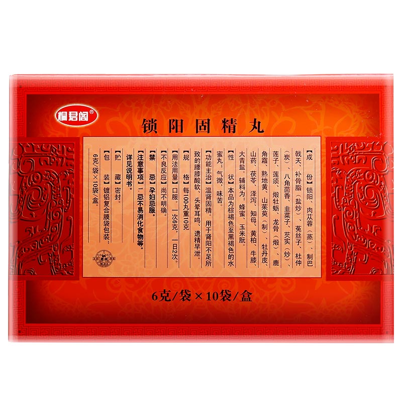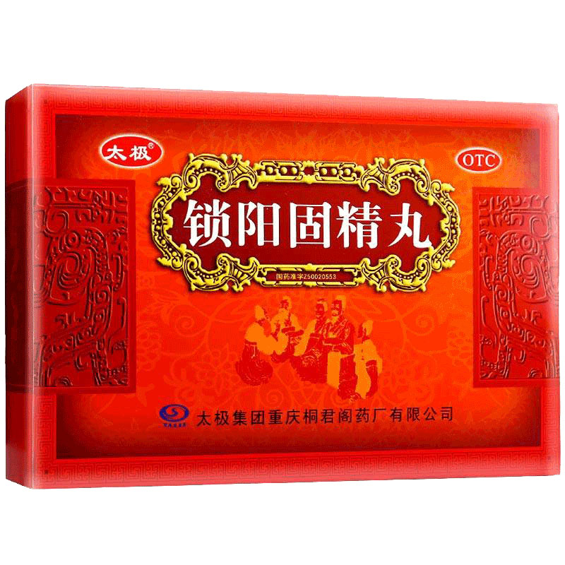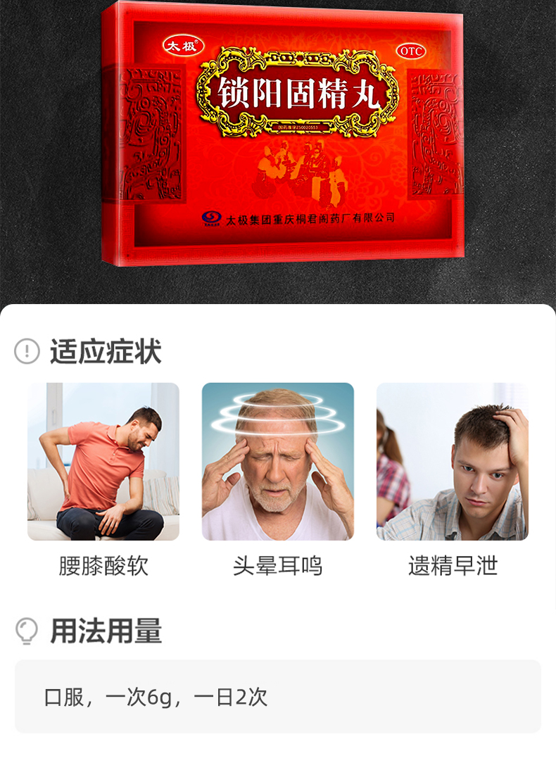 品牌 太極; 批準文號 國藥準字Z50020553; 套餐類型 1盒體驗裝】藥師建議連服6盒】 (標準裝)1盒,一次6g/袋,一日2次 (套餐一)2盒【實發3盒,15天用量】 (套餐二)4盒【實發6盒,30天用量】 3盒15天用量,溫腎固精,治遺精早泄 6盒30天用量】一次1袋,一日2次 套餐1】本品3盒+太極五子衍宗丸60g*3盒】; 生產企業 太極集團重慶桐君閣藥廠有限公司; 規格 6g*10袋/盒; 類別 中藥; 產品劑型 丸劑; 用法 口服; 使用劑量 口服,一次6g,一日2次; 藥品通用名 鎖陽固精丸; 藥品名稱 鎖陽固精丸; 有效期 36個月; 適用人群 男科; 藥品分類 非處方藥; 疾病 頭暈耳鳴 早泄 腎陽不足 腰膝酸軟 遺精 溫腎固精 脾腎虛損 遺精早泄; 癥狀 早泄 遺精 頭暈耳鳴 腎陽不足 腰膝酸軟;