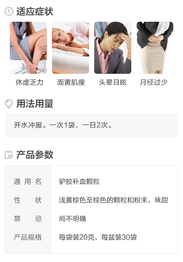 品牌 九芝堂; 批準文號 國藥準字Z43021017; 套餐類型 【養顏美容】2盒原品+森田玻尿酸面膜5片 【套餐】:2盒裝,每盒30袋 標準裝:2盒裝; 生產企業 九芝堂股份有限公司; 規格 20g*30袋/盒; 類別 中藥; 產品劑型 顆粒; 用法 口服; 使用劑量 一次20克,一日2次; 藥品通用名 驢膠補血顆粒; 藥品名稱 驢膠補血顆粒; 有效期 24個月; 適用人群 不限; 藥品分類 非處方藥; 疾病 氣虛 氣血兩虛 益氣 補血 調經; 癥狀 頭暈 頭暈目眩 無力 氣血兩虧 氣血虧損 面黃肌瘦 乏力 體虛 月經量少 氣虛血虧 血氣不足 血虛頭暈;
