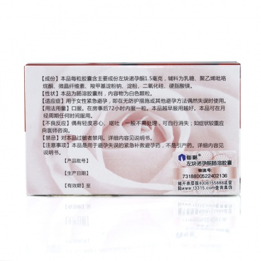 品牌 仙琚; 批準文號 國藥準字H20080459; 套餐類型 【原品1盒】買1發2 立省33.8元 【原品1盒】 原品1盒】+妻之愛外用避孕栓1盒 【原品1盒】+養生堂E軟膠囊100粒 【原品1盒】+優思明短效避孕藥1盒 本品3盒裝; 生產企業 浙江仙琚制藥股份有限公司; 規格 1.5mg*1粒/盒; 產品劑型 膠囊; 用法 口服; 使用劑量 72小時內口服1片; 藥品通用名 左炔諾孕酮腸溶膠囊; 藥品名稱 左炔諾孕酮腸溶膠囊; 有效期 24個月; 適用人群 婦科; 藥品類別 化學藥; 藥品分類 非處方藥; 疾病 女性緊急避孕; 癥狀 女性緊急避孕;