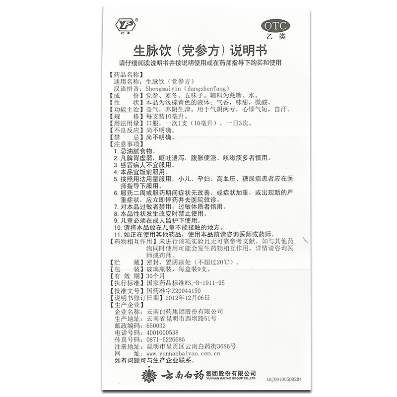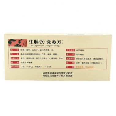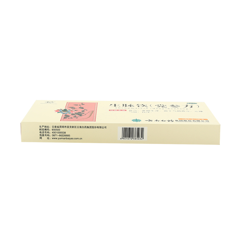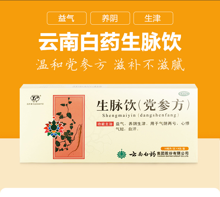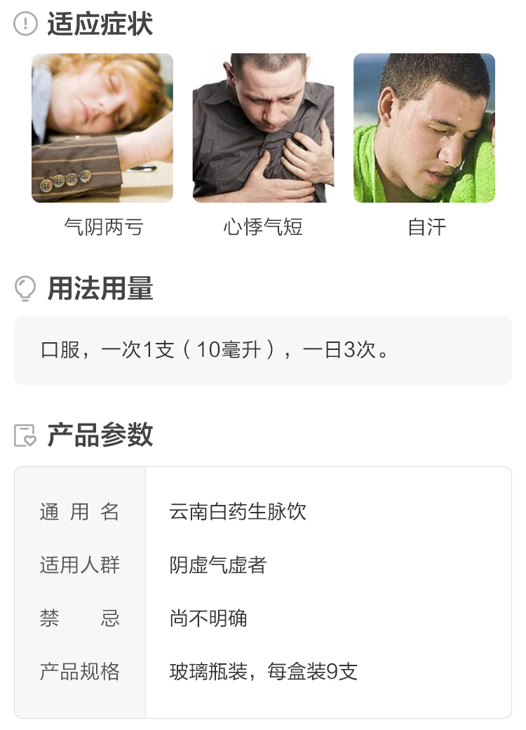 生產日期 2019年06月13日 至 2019年07月16日; 品牌 云豐; 批準文號 國藥準字Z20044150; 套餐類型 標準裝:1盒9支(一次1支,一日3次) 套餐一:3盒裝,9天嘗試量 套餐二:6盒裝,18天劑量,包郵 套餐三:10盒裝,30天月度裝劑量; 生產企業 云南白藥集團股份有限公司; 規格 10ml*9支/盒; 類別 中藥; 產品劑型 口服液; 用法 口服; 使用劑量 一次1支,一日3次; 藥品通用名 生脈飲(黨參方); 藥品名稱 生脈飲(黨參方); 有效期 30個月; 適用人群 不限; 藥品分類 非處方藥; 疾病 自汗 心悸氣短 氣虛 氣血兩虛 氣陰兩虧 氣陰兩虛; 癥狀 心悸 氣短 盜汗自汗 自汗 血氣不足;