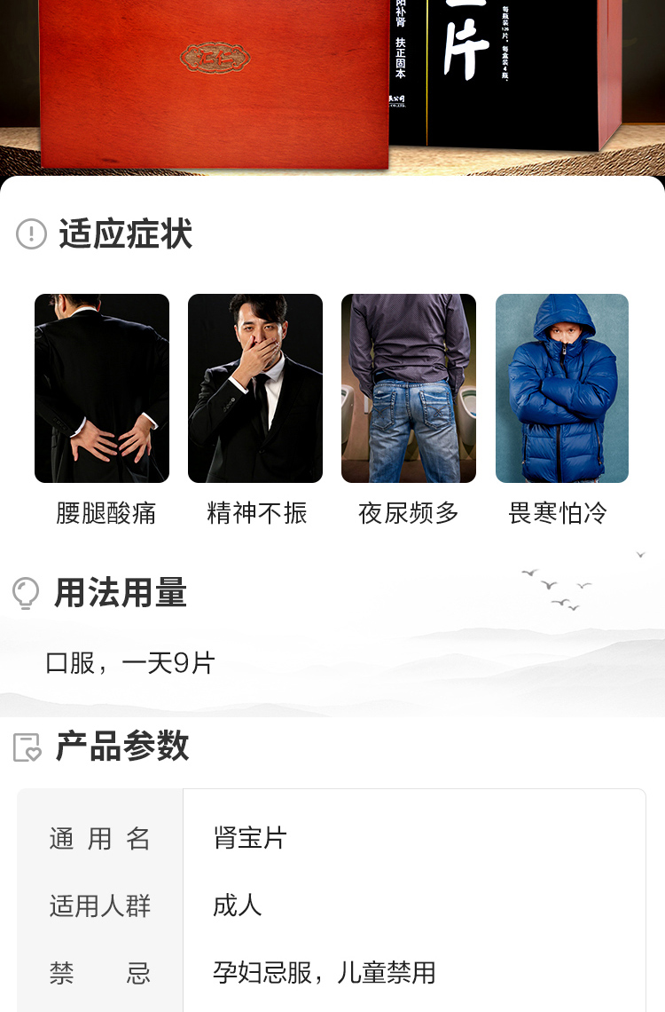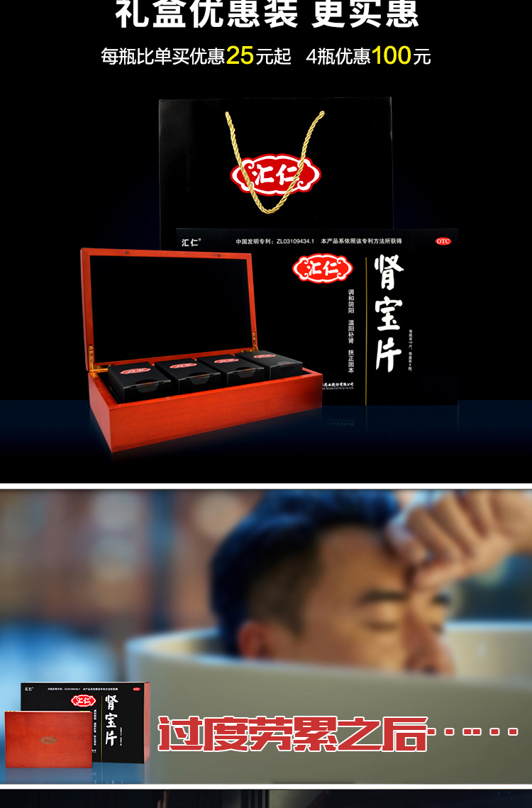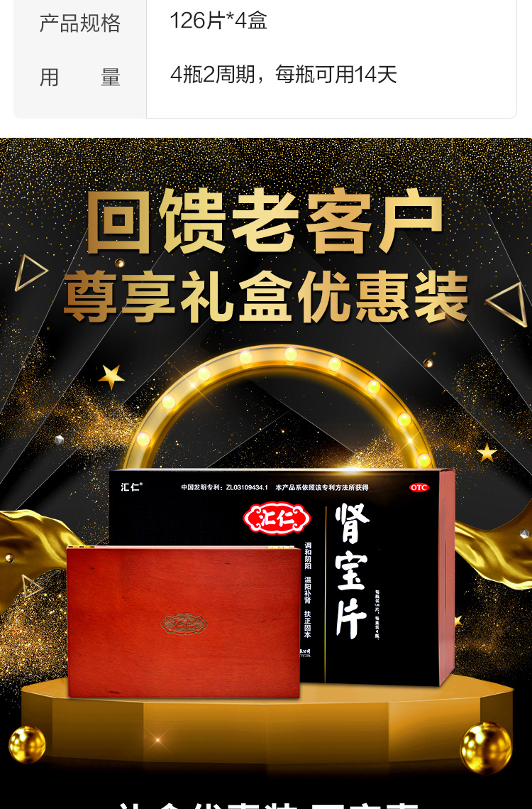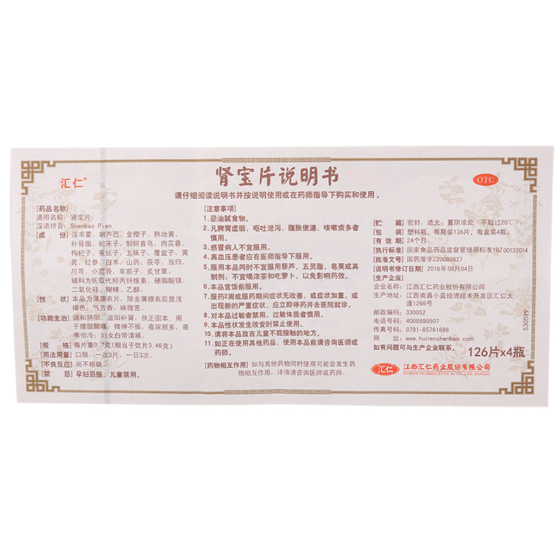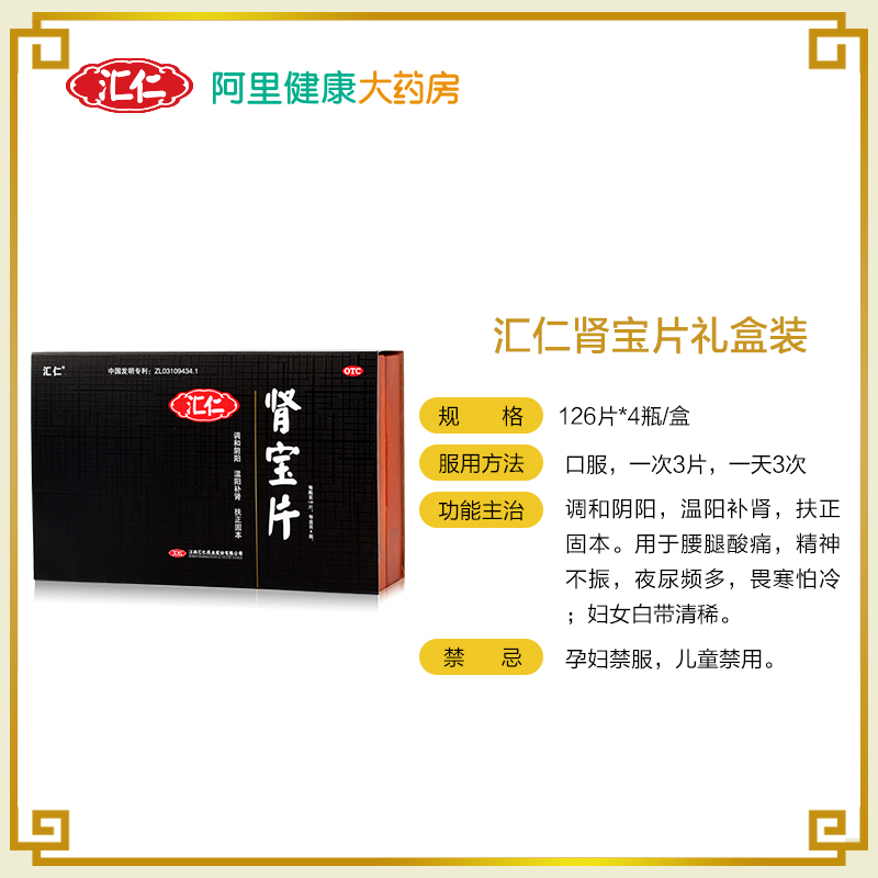 品牌 匯仁; 批準文號 國藥準字Z20080627; 套餐類型 【禮盒裝】腎寶片126片*4瓶,一日3次,一次3片。 【超值套餐】腎寶片126片*4瓶+腎寶片45片*1盒 【補腎虛治前列腺】禮盒1盒+普樂安膠囊60粒*4盒 (禮盒裝)126片/盒*4盒,一日3次,一次3片 (超值套餐)腎寶片126片*4瓶+多得腎寶片45片*1盒 (補腎虛治前列腺)禮盒1盒+普樂安膠囊60粒*4盒 【拍1發6大盒原品】腎寶片126片*4瓶*6盒,買6盒只花5盒錢。; 生產企業 江西匯仁藥業股份有限公司; 規格 126片*1瓶/盒*4盒; 類別 中藥; 產品劑型 片劑; 用法 口服; 使用劑量 一日3次,一次3片; 藥品通用名 腎寶片; 藥品名稱 腎寶片; 有效期 24個月; 適用人群 成人; 藥品分類 非處方藥; 疾病 夜尿頻多 畏寒怕冷 腰腿酸痛 婦女白帶清稀 扶正固本 溫陽補腎 精神不振 腎虧虛 腎陽虛 調和陰陽; 癥狀 夜尿頻多 扶正固本 溫陽補腎 精神不振 腰腿酸痛 調和陰陽 婦女白帶清稀 畏寒怕冷 腰膝酸軟;